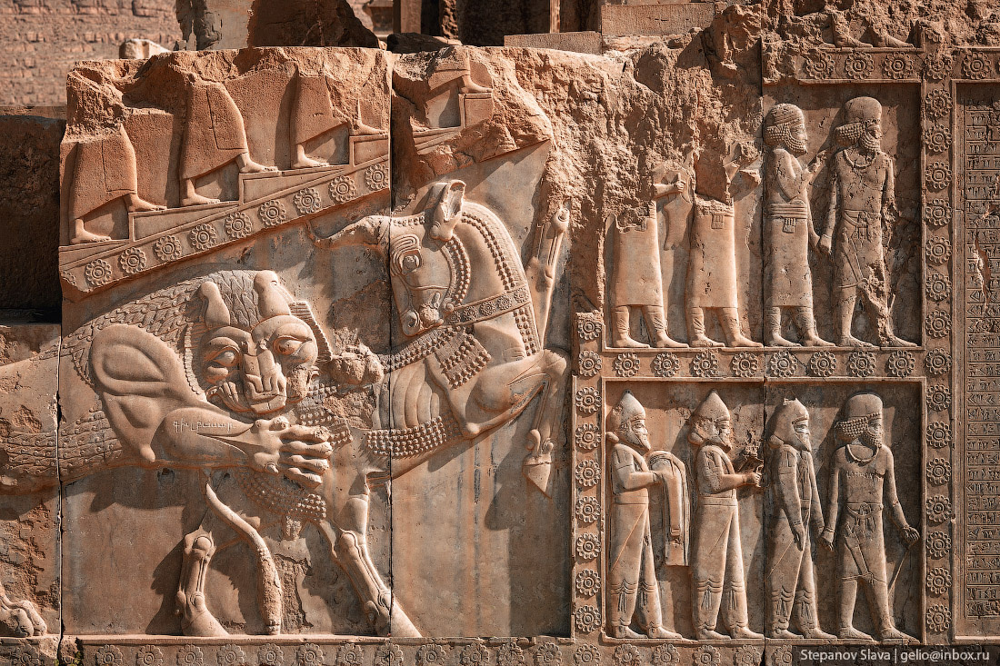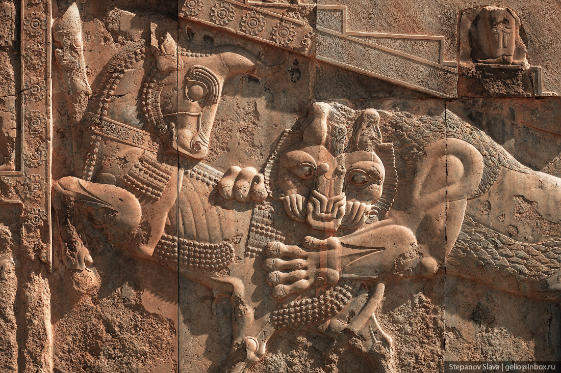 На внутренней стороне лестницы нанесён барельеф с шествием слуг и представителей покорённых народов, которые несут баранов, сосуды, бурдюки с вином. Рельефная скульптура схватки льва и быка, возможно, относятся к Наврузу - празднику весеннего равноденствия и нового года в зороастризме.