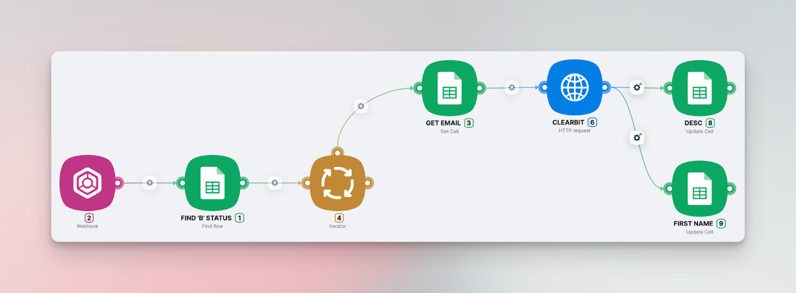 Вручную просматривать каждый домен электронной почты для сбора данных — задача трудоемкая, или даже невозможная, например, если ваша база состоит из сотен или тысяч емейлов. Вместо этого мы можем автоматизировать процесс с помощью Нодуля, подключив нашу Google Таблицу и используя API ClearBit для заполнения недостающей информации. Сценарий на платформе должен выглядеть следующим образом: