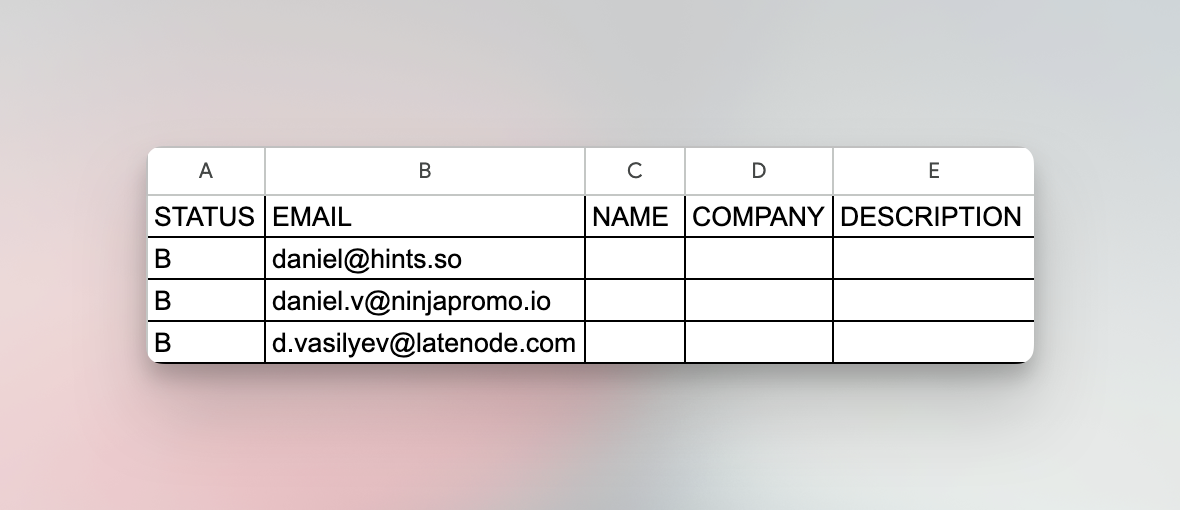 Процесс обогащения начинается с Google Таблицы, В которую мы должны занести список пользовательских емейлов. Для примера я добавил в неё несколько своих рабочих почт (прошу вас, не присылать мне холодные письма после прочтения статьи! 🙂)