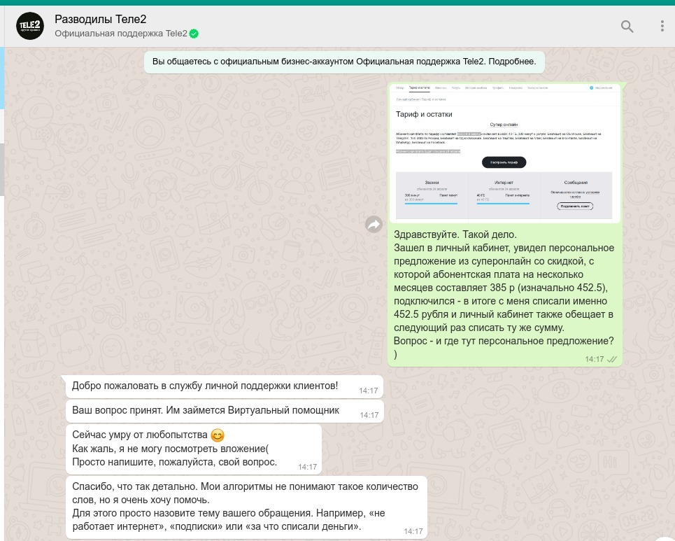 Оплатил, перескакиваю прямо из предложения - и что Вы думаете? Да, правильно, списались 425.5 рублей, при этом личный кабинет обещает и так далее списывать по этой же сумме каждый месяц. Симпатичная мордашка "искусственного теледвашного интеллекта" куда-то смылась с сайта.