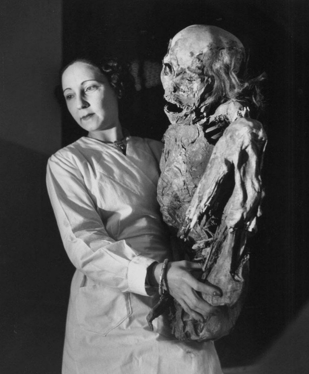 Этот редкий снимок был сделан в 1943 году в Париже и запечатлел момент, который сам по себе кажется почти мистическим. Сотрудница Музея естественной истории держит в руках древнюю перуанскую мумию, доставленную для изучения. Момент, в котором прошлое буквально оказывается на руках настоящего, поражает своим контрастом.