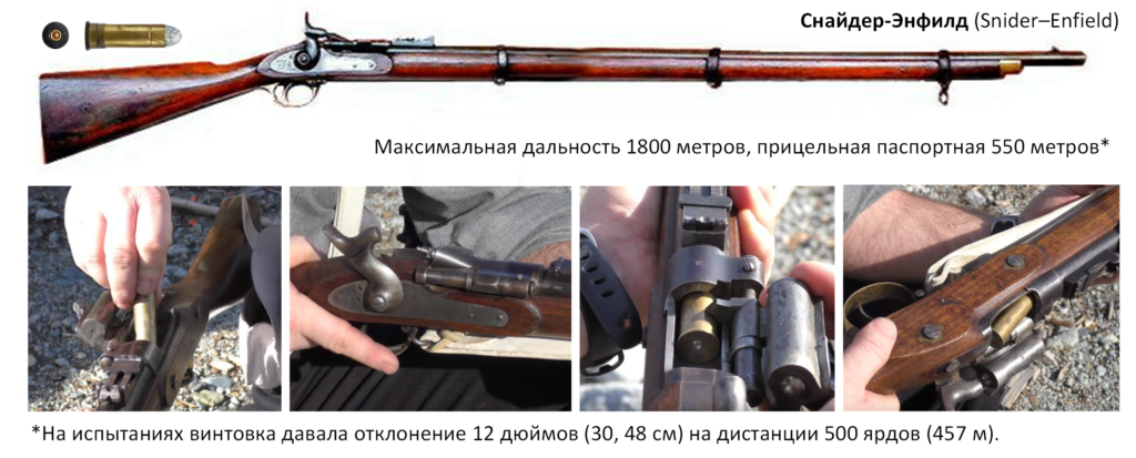 Британская однозарядная винтовка Снайдер-Энфилд (1866) под патрон .577 Snider (14,7 мм) с казённым заряжанием.
