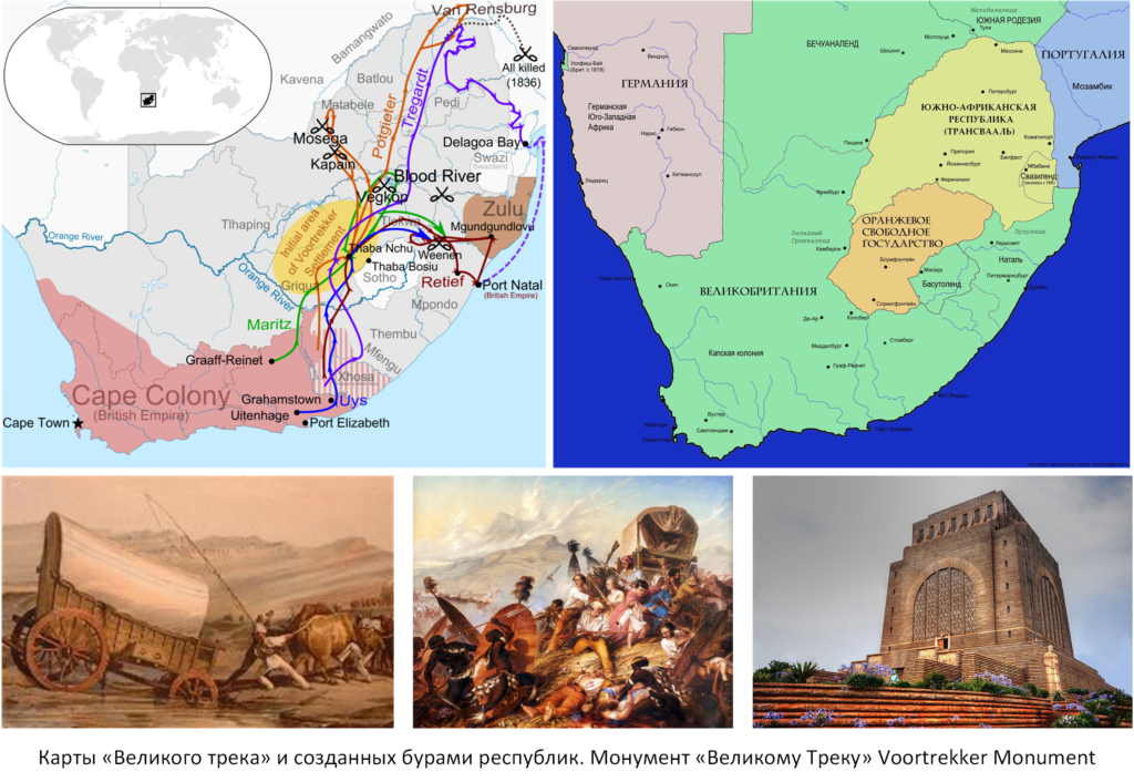 Буры – потомки голландских, французских и немецких крестьян-переселенцев, эмигрировавших в голландскую Капскую колонию, основанную в 1652 году. Занимались скотоводством, были очень набожны (протестанты-кальвинисты) и консервативны, чем-то напоминая наших староверов. После Наполеоновских войн Капская колония стала английским владением, что вызвало напряжение между бурами и новыми поселенцами. Когда в 1833 году было отменено рабство, недовольные политикой ассимиляции и размером компенсации за рабов, часть буров ушла в «Великий трек». Это был тяжелый путь, который навсегда остался в памяти народа. Караваны фургонов уходили на новые земли, непрерывно отбиваясь от окрестных племен. Буры основали две республики Оранжевое свободное государство и Трансвааль, признанные Британией в 1850-х годах.