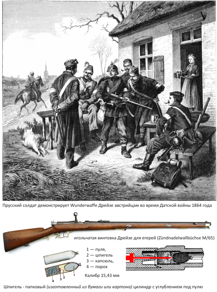 Но к франко-прусской 1870-1871 года войне 1870-1871 года это оружие уже устарело, и германская армия понесла значительные потери от винтовок Шасспо (фр. Fusil modèle 1866). Эта винтовка была создана на основе системы Дрейзе, но имела ряд преимуществ: меньший калибр, больший заряд пороха и донное расположение капсюля. Всё это давало прицельную дальность 1200 метров, что в два раза превышало показатели винтовки Дрейзе. Кроме того, из-за расположения капсюля, требовалась более короткая игла, что повышало надежность винтовки. Но более совершенное оружие не спасло французскую армию от разгрома.