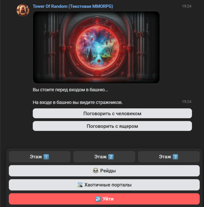 Вход в башню представляет из себя этажи, рейды и хаос-порталы. И можно поговорить со стражниками. До 10 лвл у них просто забавные диалоги, а после один дает написать ник, а второй дает установить загруженную вами аватарку.