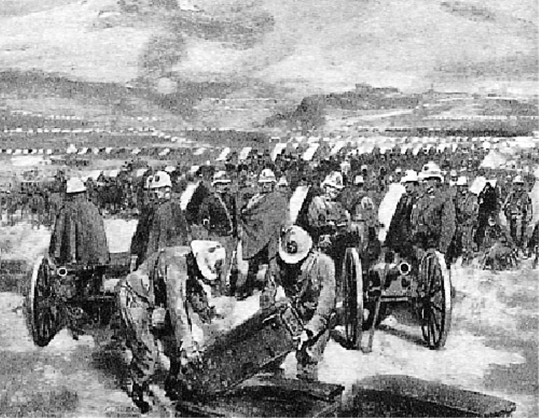 Итальянские колониальные войска с орудием во вьюке, офицеры узнаваемы по роскошным синим шарфам через плечо. Рисунок современника.