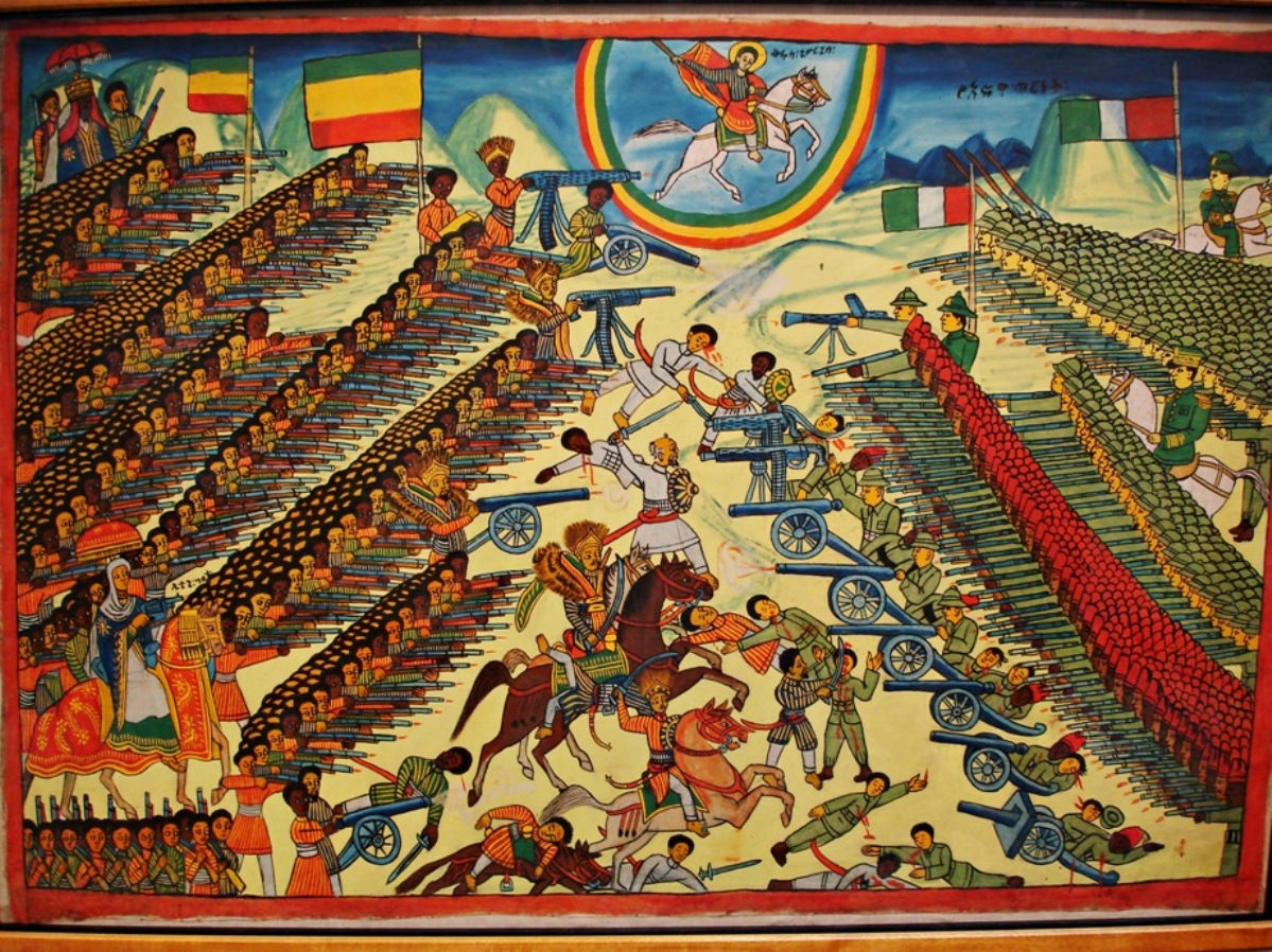 Абиссинская народная картина, изображающая битву при Адуа в самом разгаре, Святой Георгий в сиянии национальных цветов Абиссинии вдохновляет ее защитников: