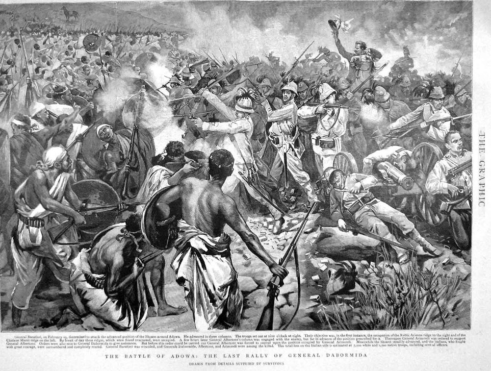 После полудня 1 марта 1896 г. на кровавых холмах близ Адуа исход сражения был уже ясен: итальянские войска беспорядочно отступали. Ушедшая в преследование абиссинская конница раса Мангашиа через несколько часов вернулась, переловив немногих отставших. Объясняя "негусу негушти" причину неудачи преследования, рас изумленно заявил: "Пешком они бегут быстрее наших коней!" Действительно, остатки экспедиционного корпуса генерала Баратьери поставили своеобразный рекорд по скорости бегства: отмахали за один переход 70 км!!! Но, к их чести, надо подчеркнуть: ни один из эвакуированных с поля боя 1,5 тыс. раненых не был брошен.