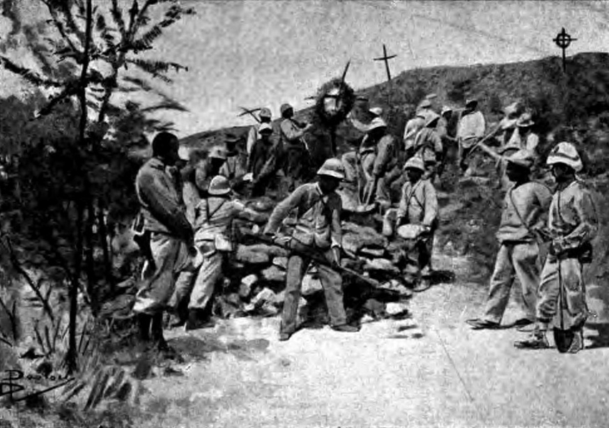 Здоровые военнопленные были приставлены к работе. Их первым печальным занятием стало погребение тел погибших в недавней битве. На могилах своих товарищей итальянцы ставили простенькие деревянные кресты, украшенные венками, сплетенными из ветвей колючего кустарника с плоскогорья Адуа - терновый венец павшему солдату Италии...