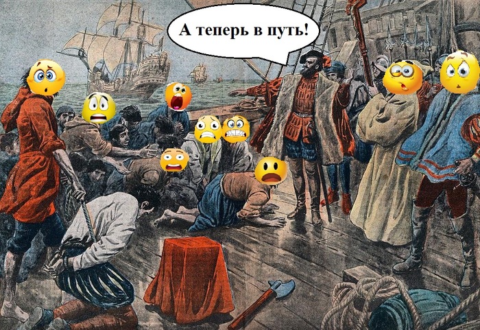 Да ещё и подчинённые мне капитаны-испанцы люто возненавидели меня из-за того, что экспедицией руководит португалец, то есть я! Несчастные расисты националисты! Начались даже беспорядки, чудом обошлось без жертв! Мне даже приказали взять не более пяти соотечественников, но где взять экипаж, если никто не идёт? Пришлось изворачиваться. Со мной всё же поплыло 40. Из 265 (не считая рабов, сверхштатных специалистов и пассажиров). Не смотря на строгий надзор, удалось протащить нескольких женщин. Нескольких на 265. Бедные.