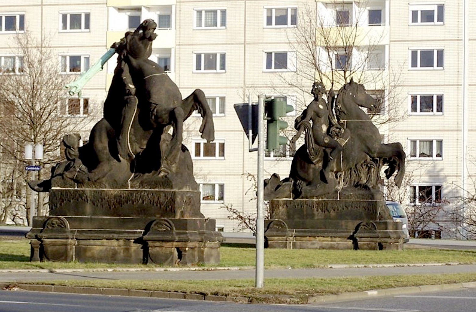 Позади жительницы Дрездена баррикада, оставшейся после боев. Ещё можно увидеть статуи всадников. Автор немецкий скульптор Фридрих Офферман. Скульптурная пара стоит у въезда на мост королевы Каролы (Каролины) через Эльбу, который был взорван немцами 7 мая 1945 года.