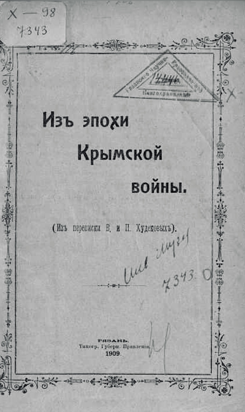 Из эпохи Крымской войны : (из переписки В. и П. Худековых). - Рязань : типография Губернского правления, 1909. https://www.prlib.ru/item/723172