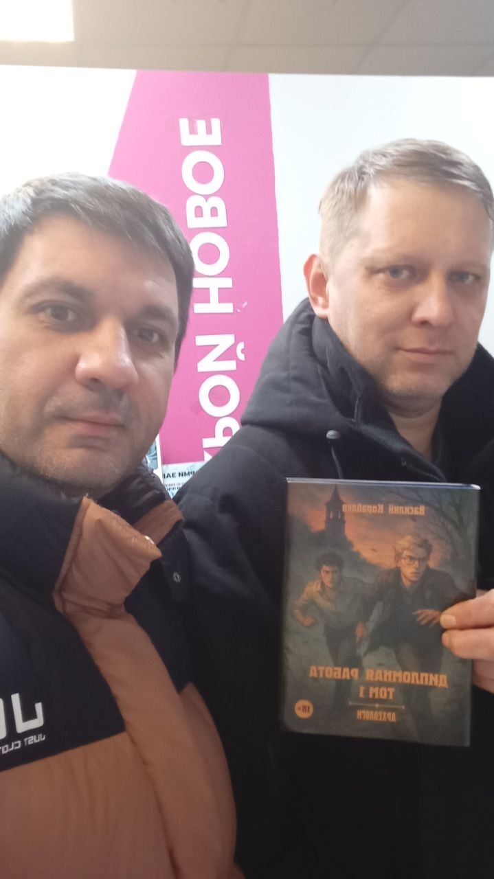 фотка с читателем, который приехал за книгами из Москвы. Книги в белом пакете между нами Артём я не буду тебя палить, фамилия же не указана.