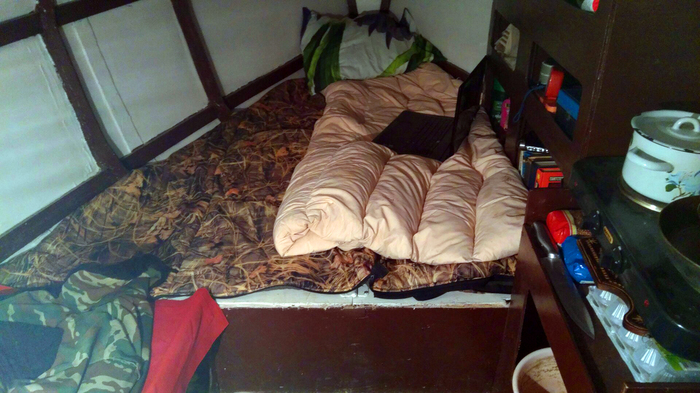 Оставался на яхте и помимо дней в походах. На базе причал рядом с розеткой, так что протянул себе провод и все удобства. Конечно, на будущий год хочется автономное освещение сделать, но это уже второстепенная задача. Так же с матрасами на кровати нужно что-нибудь придумать. Понятно, что всё это скорее убежище для походных условий, но всё же.