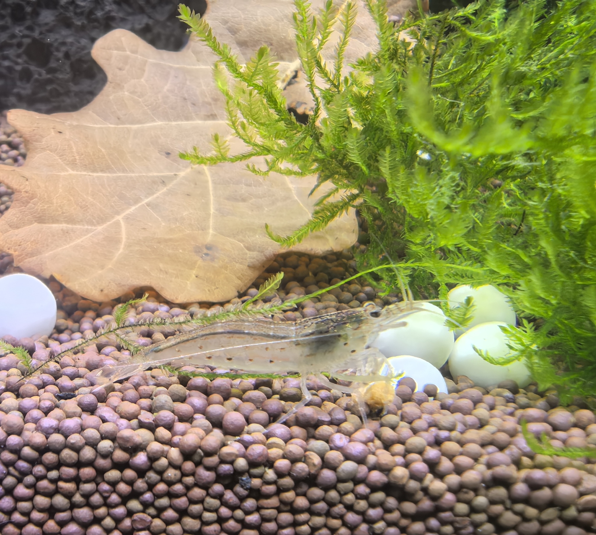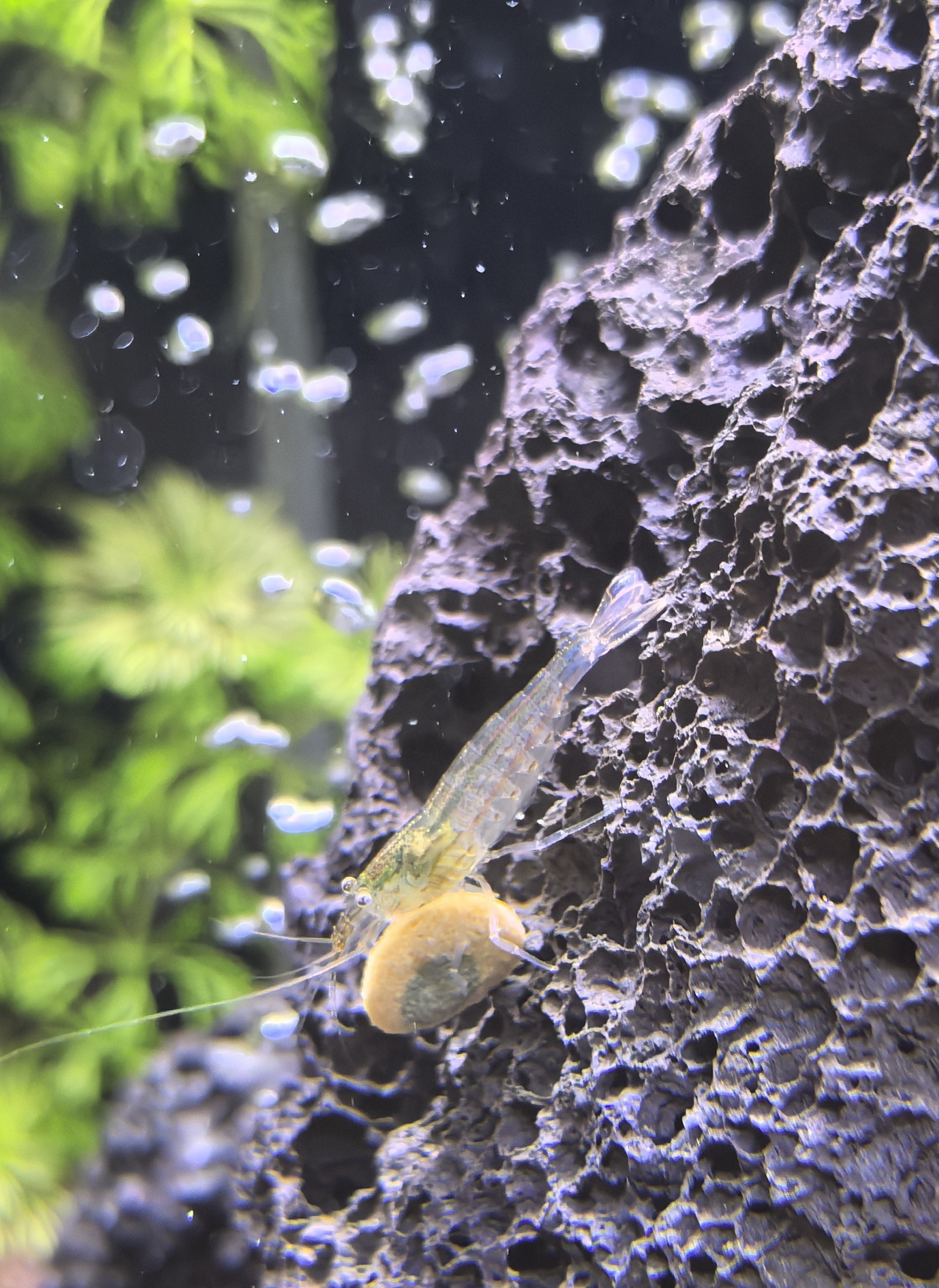 На сегодняшний день, после подселения Аманок, прошла неделя. Параметры воды остаются стабильными и не изменяются, судя по тестам, подмены не нужны, пока просто доливаю свежей реминерализованной воды, для компенсации испарения. Обрастаний и видимых загрязнений не наблюдается. Креветки чувствуют себя хорошо, кушают, жадничают, резвятся и не пытаются сбежать. Кормлю 1 раз в пару дней, порционно, ничего не остаётся.