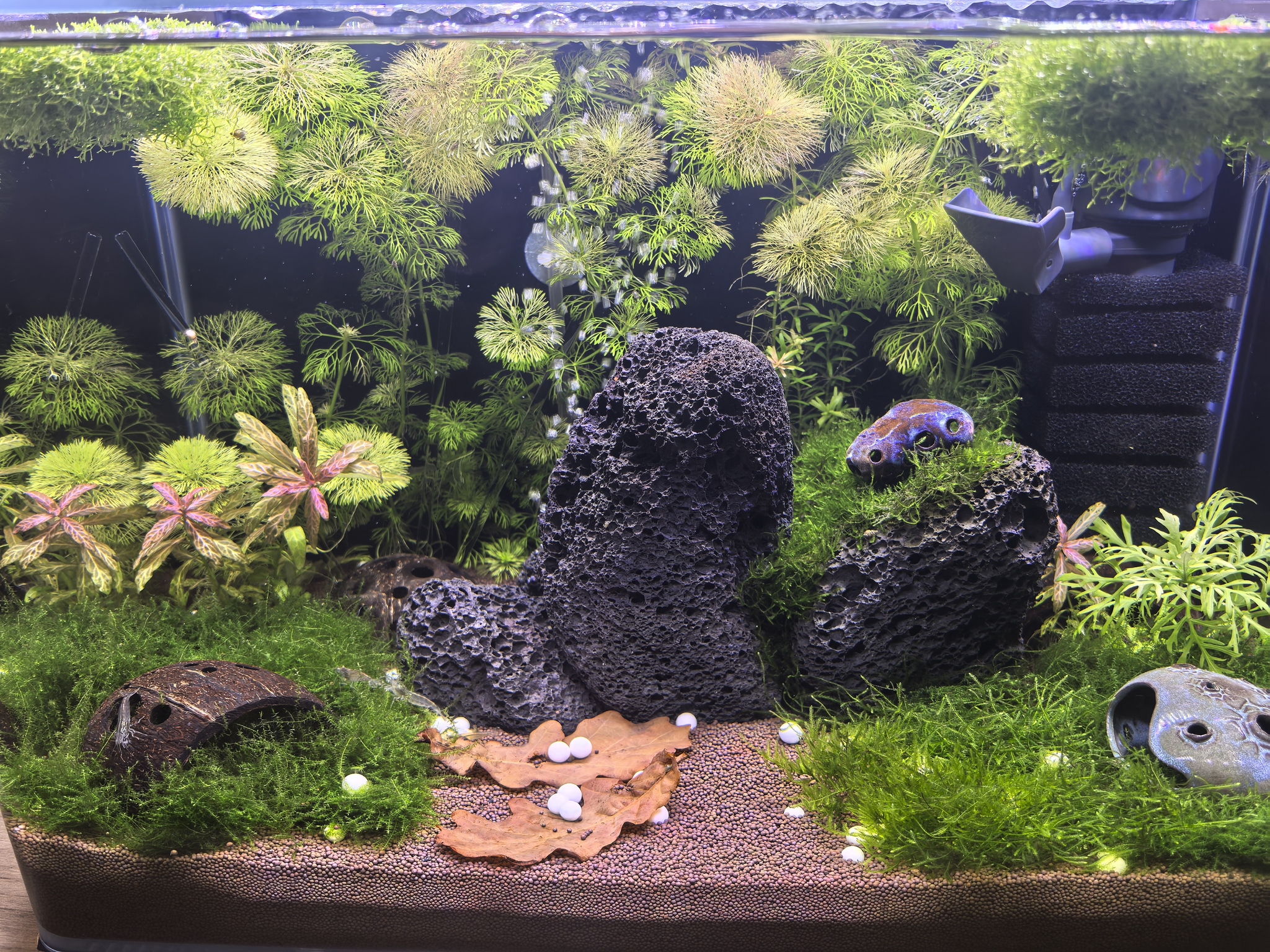 Далее, через неделю или две, планирую заселить штук 20-25 креветок "кровавая Мэри" и Бабаулти, в соотношении 50/50. Жду пока морозы пройдут у нас в регионе и можно будет привезти их из другого города, в нашем, к сожалению, ничего кроме вишен и блю дрим найти не удается.