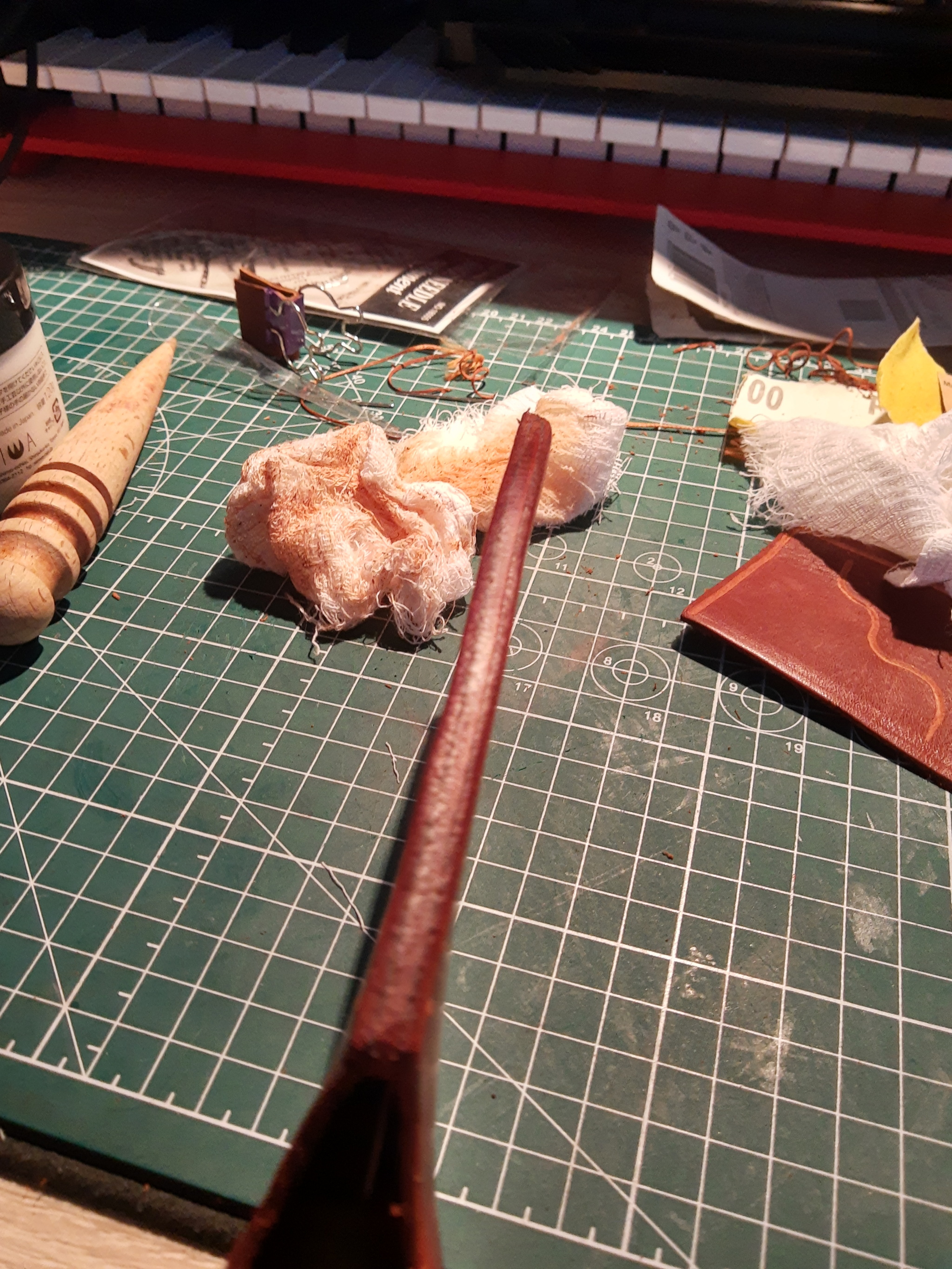 Много я заказал одинаковой кожи на пробу. Продолжаю её вырабатывать. Кожа толстая (+/- 4мм) и на галантерейку не идёт совсем. Хранить её желания нет, да и учиться на дешёвой оно как-то логичнее. Работаю с тем, что есть.