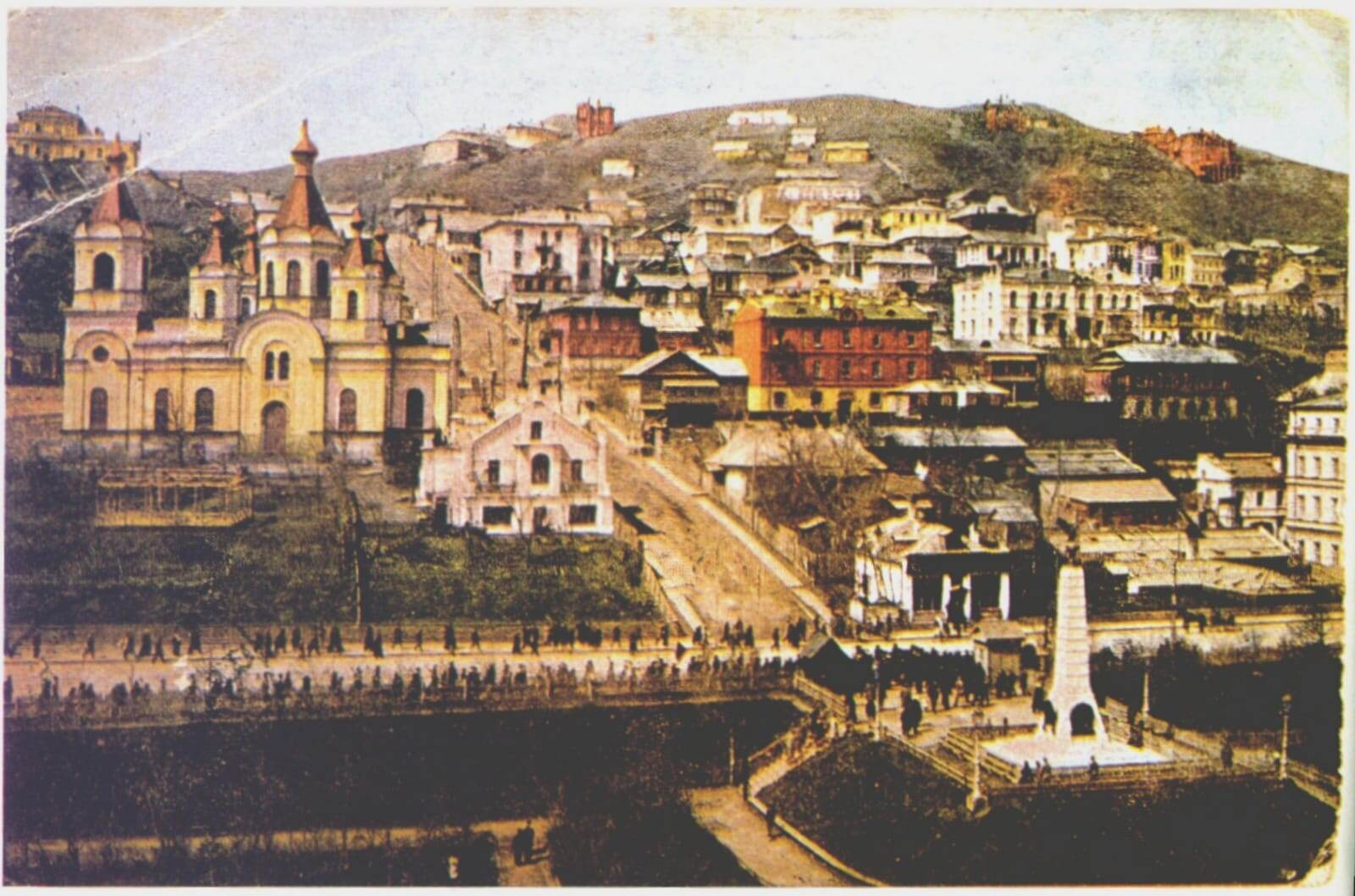 Владивосток. Памятник адм. Г И. Невельскому, Успенский собор и идущая вверх улица Успенская, нижняя часть которой уже не существует, а верхняя называется улицей Луцкого