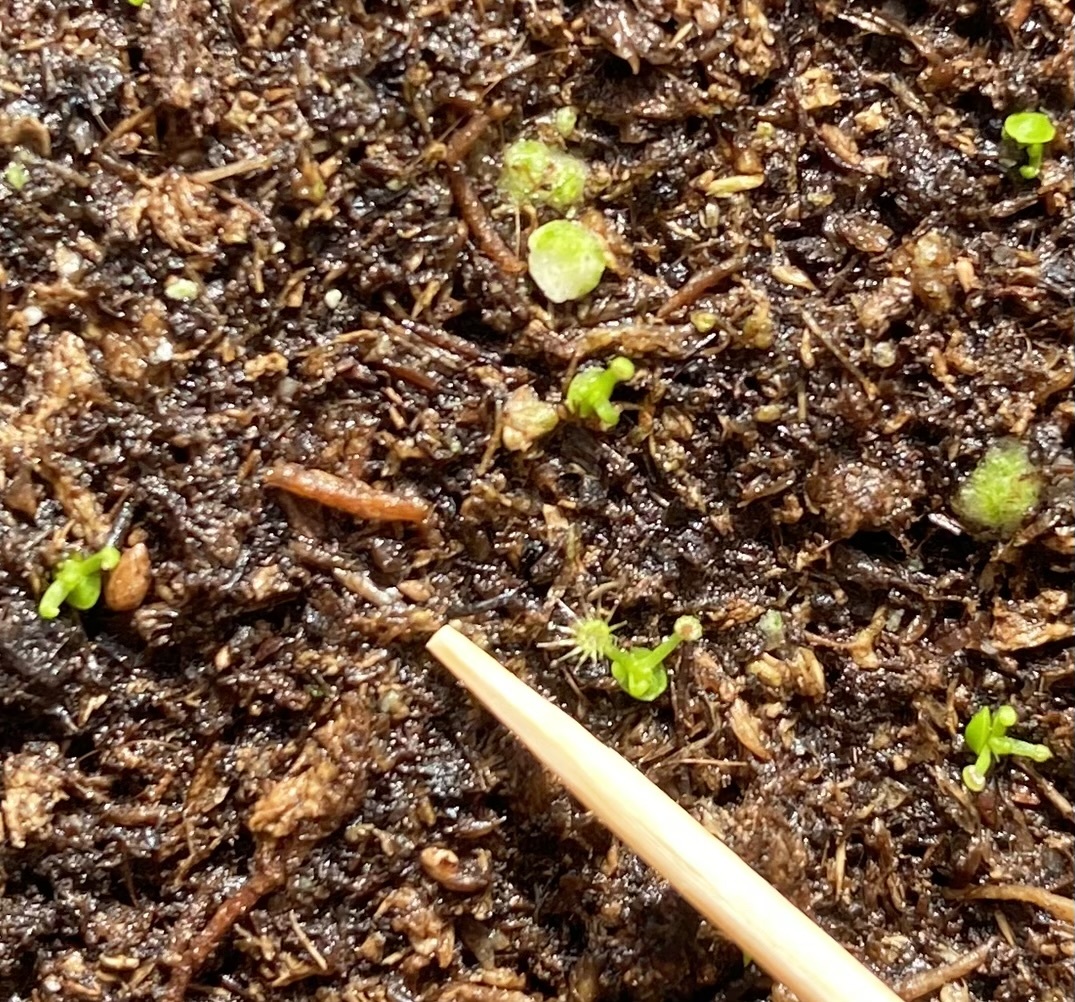 Хвастаюсь своим садиком из сеянцев карликовой австралийской росянки. Этот вид карниворов является гибридом, относятся данные росянки к пигмеям, взрослое растение около 2 см. Размножаются геммами. Это видоизменённые листья в центре розетки, которые появляются после периода покоя с высокой температурой летом, всхожесть свежих гемм-100%.
