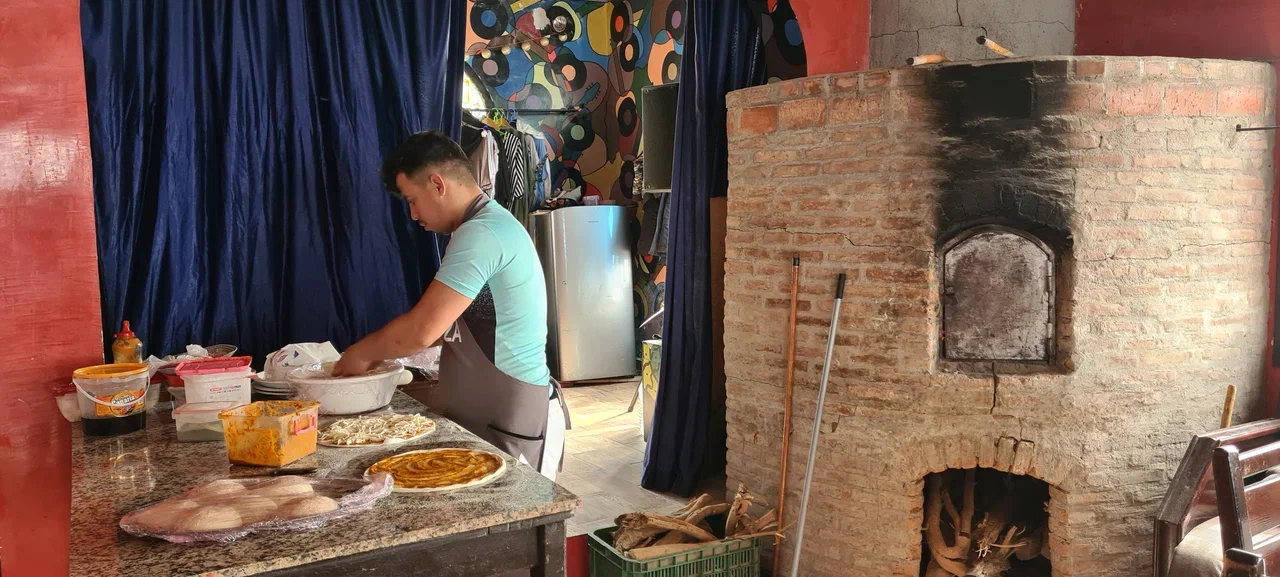 Сперва там минут 15 горят дрова, в это время пекарь готовит блин,