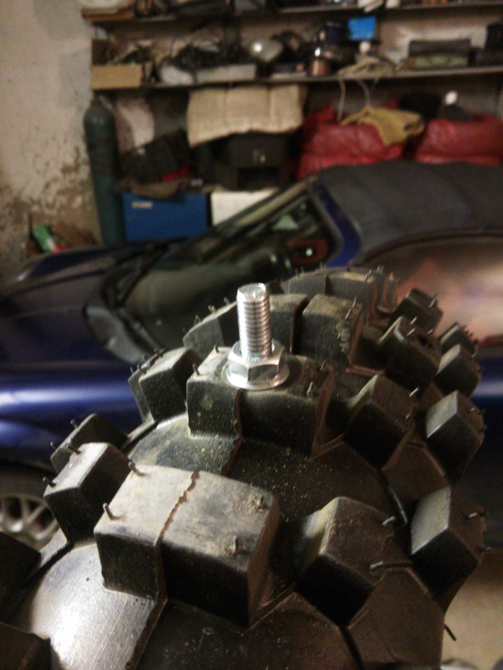 Болты это слишком для шиповки, колесо тяжелеет в разы. Мы шипуем дюбелями. Дюбель-шайба-гайка-сварка на одну точку. Ничего не стачивается, не откручивается, зацеп на льду лучше чем летом на грунте.