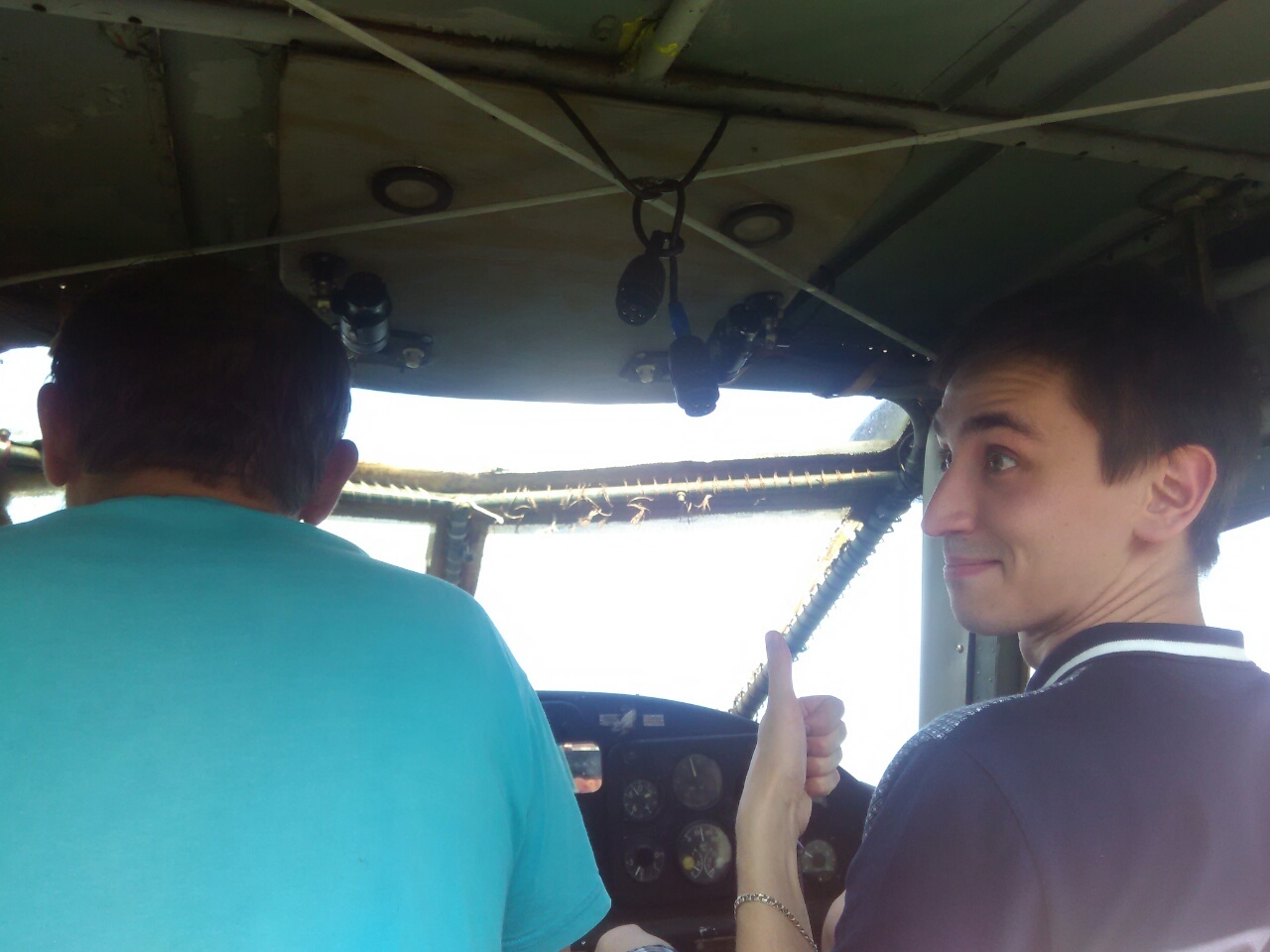 Моя первая фраза:"О, кукурузник!!!", - но меня вежливо поправили:"Не кукурузник, а ЯК-12". Заплатили мы за топливо с троих 1500р за час полета - очень бюджетно. Слетали до Монастырщины, от Монастырщины до Красного и вернулись в точку отправления. Из всего полета меня удивило то, что стояла жуткая жара, дождя не было около 10 дней, а в воздухе на высоте ~1500 метров дважды попадали под дождь. Все очень понравилось, совсем не было страшно, за исключением посадки, когда в какой-то момент пилот сбавлял обороты и на долю секунды чувствовалось что-то вроде падения. А еще дали чуточку порулить (это учебный самолет и там два комплекта штурвалов и педалей управления).