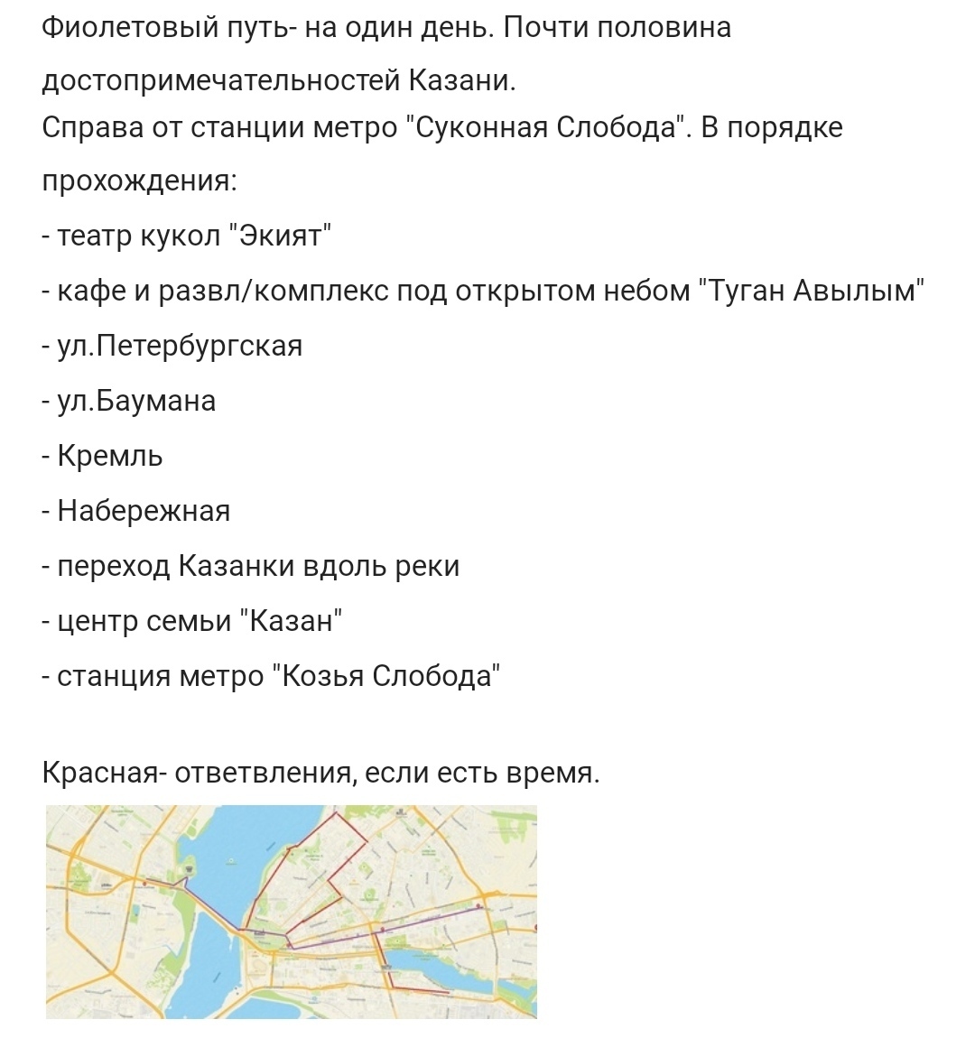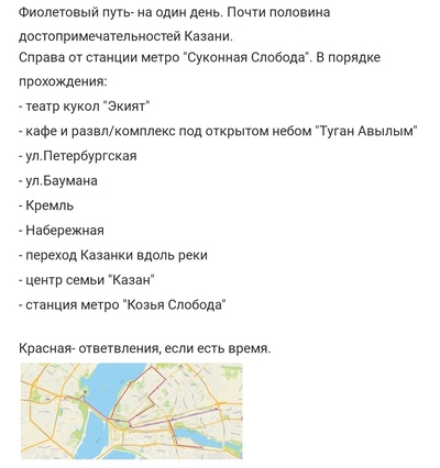 Прогулки с семьёй: набережная Кабана, набережная Казани под Кремлём, водные экскурсии по Волге из речпорта, берите подольше, Волга и береговые пейзажи красивейшие. Жильё/номер старайтесь снять в шаговой доступности от метро , станций мало, но вам для экскурсий хватит. Казань сейчас капитально в пробках стоит, идёт ремонт дорог к БРИКСу, лучше передвигаться на трамвае или метро, яндекс все покажет.Кремль, банально и малоинтересно, но если уж приехали , то сходите. Экскурсии на 2хэтажных автобусах по городу интересны. Питание если не сами готовите, смотрите по отзывам на гуглкартах или яндексе, на любой кошелёк. Шаурму не бойтесь, кошки свежие, узбеки руки моют вроде.