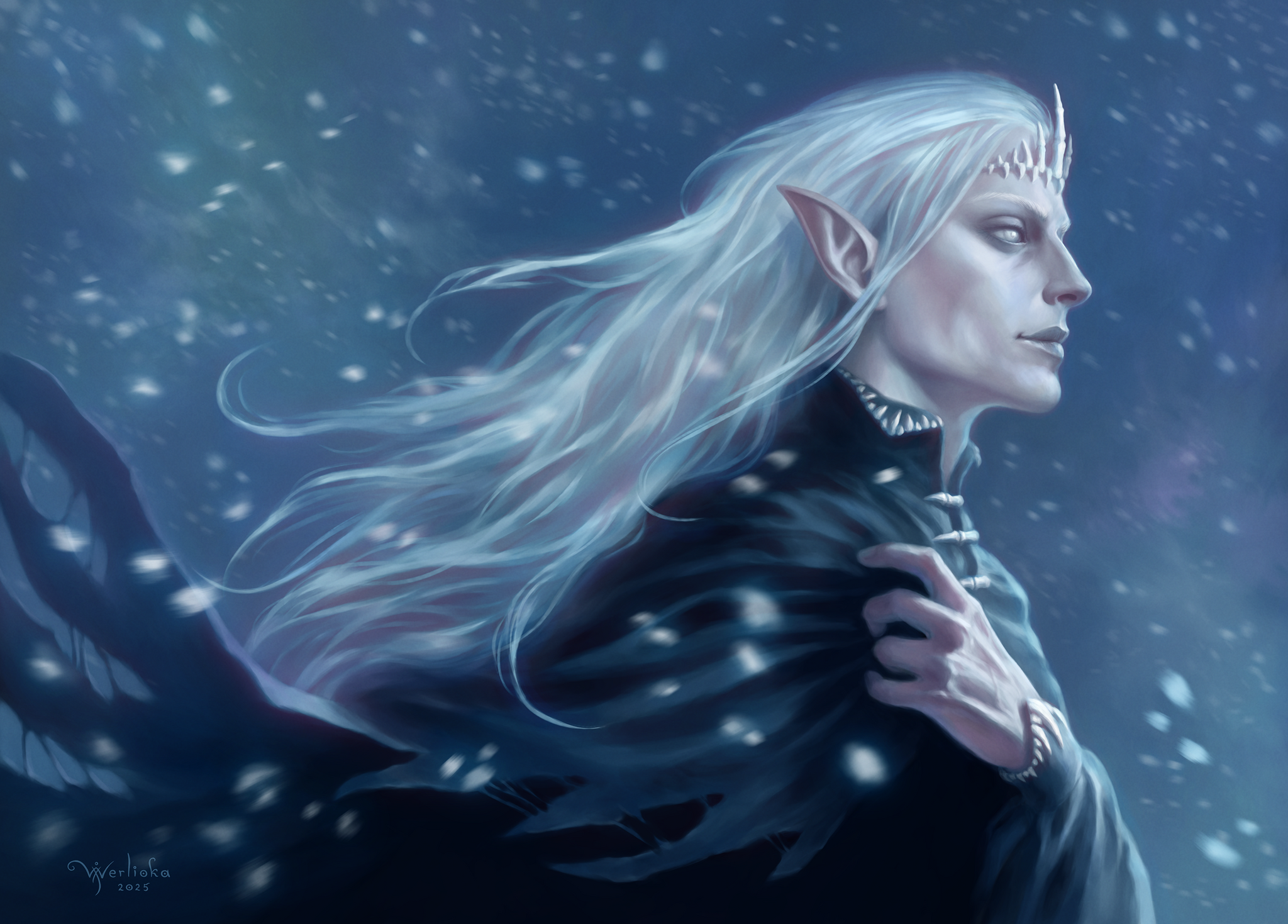 Сегодня зима ассоциируется с праздниками, подарками и развлечениями, а выпавший снег радует не только детей, но и взрослых. Но для наших предков эти месяцы были тяжелейшим временем борьбы за выживание, борьбы с лютым холодом и нехваткой еды. Поэтому дух зимы на моем рисунке красив, но безжалостен, слеп, как и полагается стихии, а одежда его украшена мелкими косточками. Это не какой-то конкретный персонаж фольклора, а персонификация зимы, как я ее вижу.