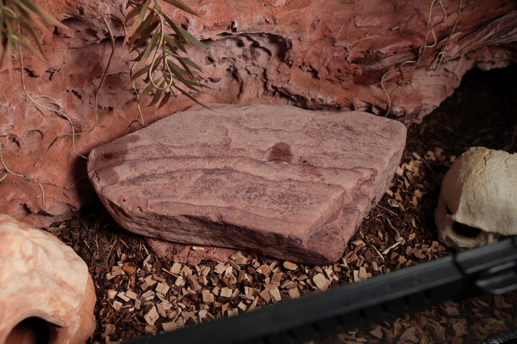 Центральный камень, он же кормовой стол. Абсолютно натуральный булыжник, на который выкладывается мышиная заморозка. Так меньше риска, что вместе с едой змея заглотит и частички субстрата (разные щепки и т.д).