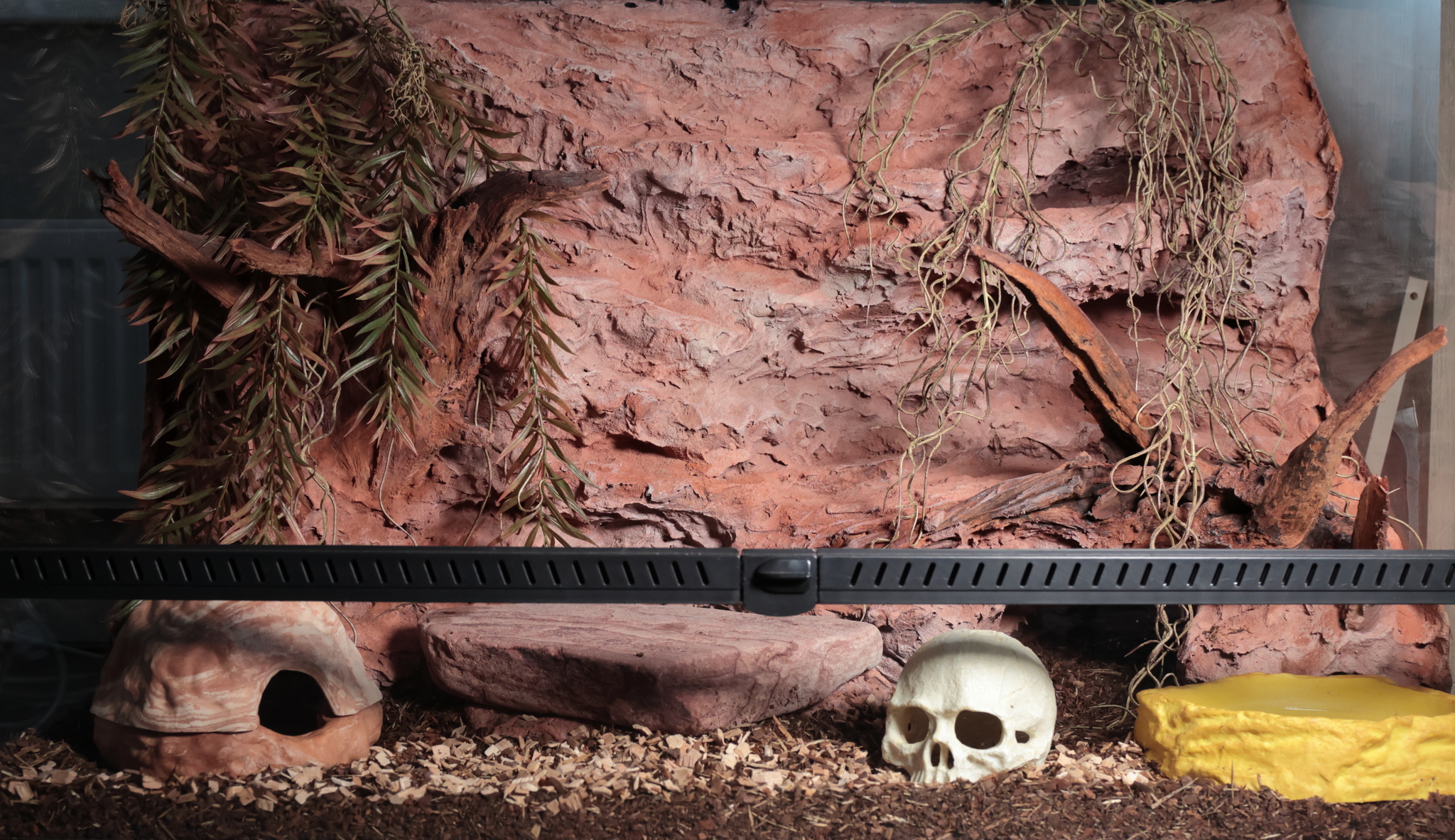 Змеи любят забраться куда-нибудь поглубже, там свернуться поплотнее и максимально не отсвечивать, а раз так, то надо им обеспечить возможность отдохнуть с комфортом. По этому при оформлении в сам "ландшафт" было заложены две пещеры-укрытия, одна с подогревом у дна, другая ближе к вентиляционной решетке, с возможностью остыть в жарки летний день.