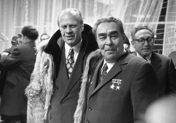 Президент США Джеральд Форд, Генеральный секретарь ЦК КПСС Леонид Брежнев и Госсекретарь США Генри Киссинджер во Владивостоке