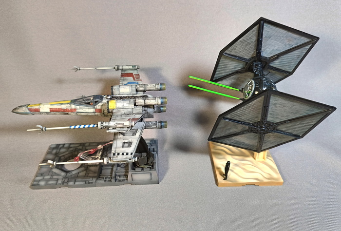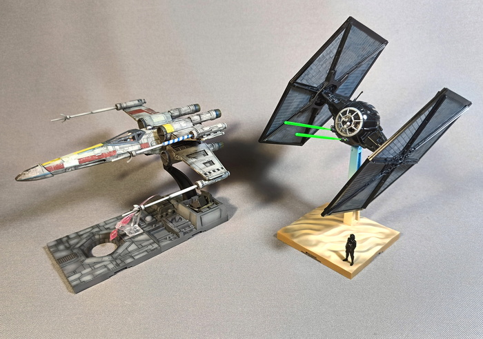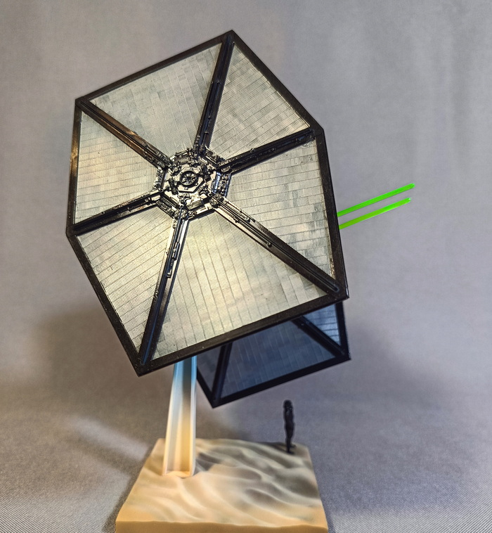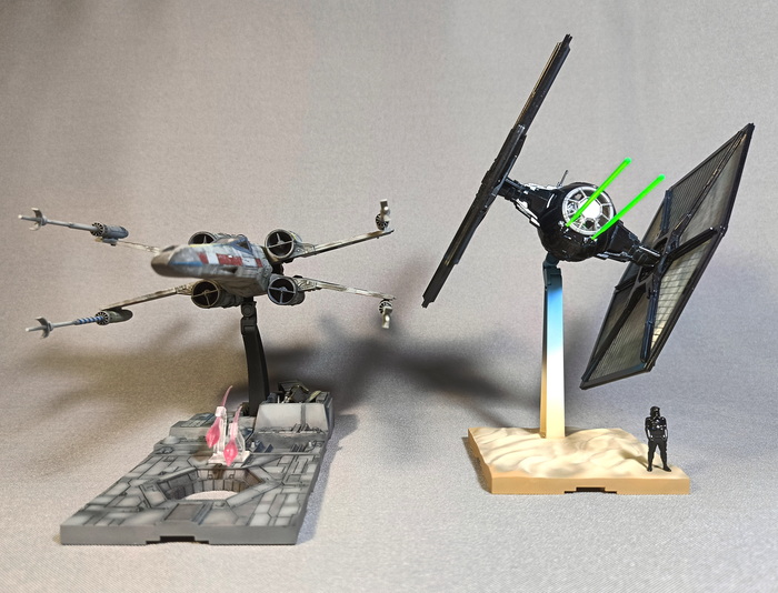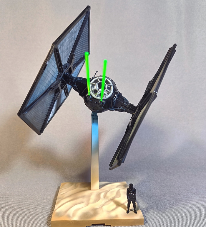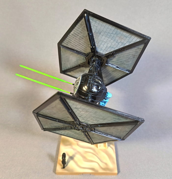 Представлена модель TIE/fo fighter во время сражения с «Тысячелетним соколом» над поверхностью планеты Джакку. Модель фирмы Bandai, масштаб 1/72.
