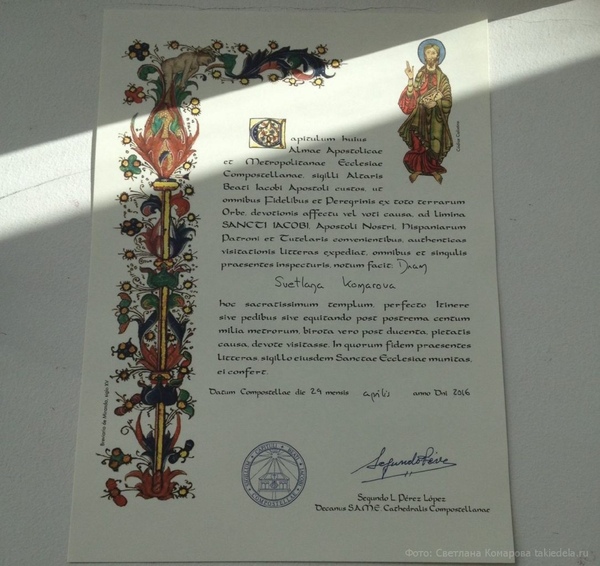Я получила компостелу. Из всего текста, обрамленного сложным орнаментом, понимаю только свое имя. Ужасно, если она помнется. Как я смогу довезти ее в рюкзаке до Москвы? Мне протягивают плотный тубус. Я окончательно счастлива, прижимаю к груди тубус и выхожу на улицу. В горле ком.