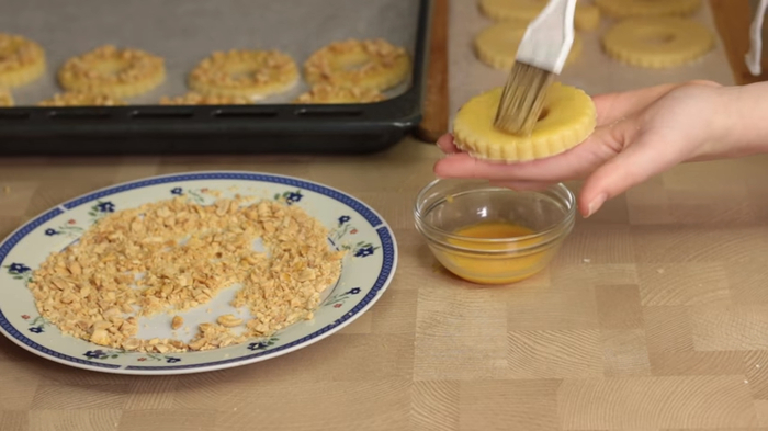 Кольца посыпать орехами и поставить в морозильник на 15-20 мин.