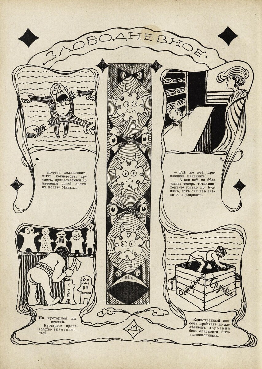 О работе в «Шуте» он позже вспоминал так: «Глупее всего было то, что, закабалив себя ради жалования, я на своей службе не получал пока ни копейки! Полагалось выдержать какой-то законный срок! Но как раз именно под крышей этого допотопного учреждения неожиданно открылся источник небольшого постороннего и постоянного заработка. Среди моих скучных и сонных геморроидальных сослуживцев оказался один жизнерадостный молодой человек Мазуркевич, круглолицый и румяный, с эспаньолкой и в золотом пенсне со шнурком, хохотун и анекдотист и вдобавок стихотворец — совсем роза среди чертополоха… От скуки я раз не утерпел и нарисовал в карикатурном виде одного из чиновников. М[азуркевич] подглядел карикатуру, и ему пришла блестящая мысль делать вместе со мной еженедельную страницу в “Шуте” — “недельные (это казалось, вероятно, ужасно остроумно) наброски”, — и стал меня соблазнять верным заработком. И увы, как меня ни коробило сотрудничество в этом пошловатом издании, я скрепя сердце согласился. Рисовал я “инкогнито” — вместо подписи ставил монограмму “М. Д .”, которая походила на шляпу, и, хотя злободневные темы были самые плоские, меня занимало выдумывать общую страничную композицию и упражняться в чистоте штриха». Художник пытался поступить в Академию художеств, но попытка не увенчалась успехом.