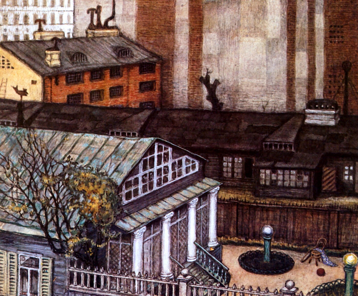 Из воспоминаний художника об этом периоде жизни в Петербурге: «Я не помню точно, почему мы с женой выбрали именно Измайловский полк, чтобы там поселиться. Кажется, просто подвернулась по газетному объявлению удобная квартира в 6-й роте. Роты мне были знакомы еще в детстве: на 1-й роте когда-то жил дедушка, а в старинном доме Гарновского на углу Фонтанки, где были казармы Измайловского полка, жила моя тетя, Катя Маклакова, и белый Троицкий собор, который я знал и любил еще с детства, — эти воспоминания делали почти родным это место. В тихих улицах (ротах) и посейчас держался особенный, петербургский уют, и стояли еще нетронутыми маленькие ампирные домики, каменные и деревянные, двухэтажные и трехэтажные, часто с мезонинами, с гипсовыми классическими масками или венками над окнами. Не шумной была и 6-я рота, где находился только что выстроенный дом, в котором мы поселились...Через год мы переехали в соседнюю 7-ю роту, где и прожили целых семь лет. Улица была пролетарская, шумная, с извозчичьими дворами и трактирами. Но наш пятиэтажный кирпичный дом стоял в глубине двора, отступя от улицы, на которую выходил длинный фасад низенького старинного особнячка хозяина, выкрашенный в зеленый цвет, со ставнями и белыми ампирными украшениями над окнами. Во дворе был садик с высохшим фонтанчиком посередине и высокими, хотя и чахлыми, деревьями и качелями. Сбоку же садика высились черные штабеля дров и целая гора каких-то красных саней розвальней. Эта неказистая, но ставшая мне милой петербургская "усадьба" была неоднократно мной изображаема и в летнем ее виде, и в уютном снежном уборе…