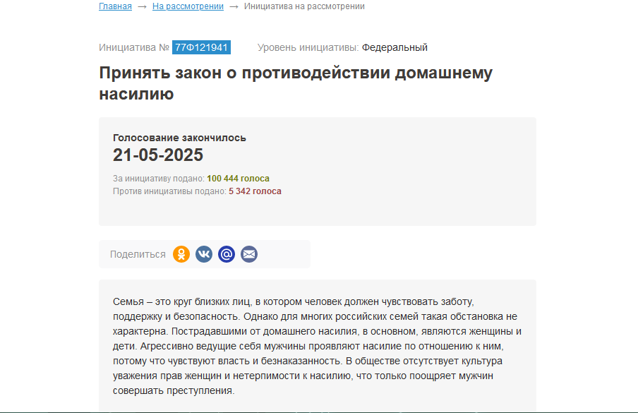Петиция о принятии закона против домашнего насилия на платформе «Российские общественные инициативы» (РОИ) преодолела порог в 100 000 голосов, необходимый для ее рассмотрения на федеральном уровне.