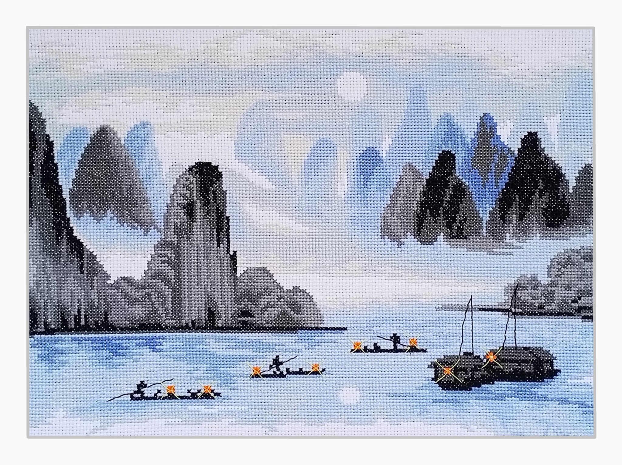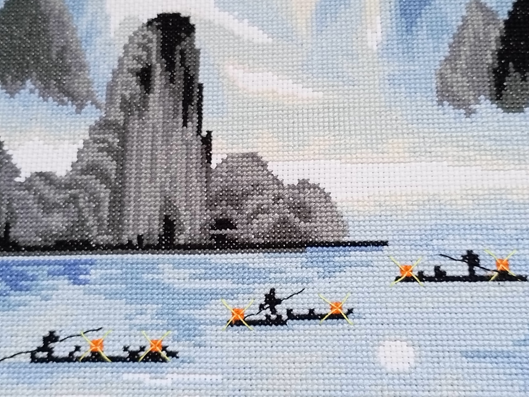 Что ещё добавить? Канва плотный белый хлопок, оверложена по краю. Мулине было 15 цветов отрезами по 1м, после работы остался запас около 30-40%, вышивала в 2 нити. Зашивка идёт не полная, счётным крестом, немного бэкстича на лодках. Сам процесс шёл легко, цвета расположились удобными островками, не приходилось часто перескакивать с одного на другой. В рамку пока не оформляла, думаю, может затонировать всё полотно в слабом растворе чая? будет похоже на старинную гравюру?