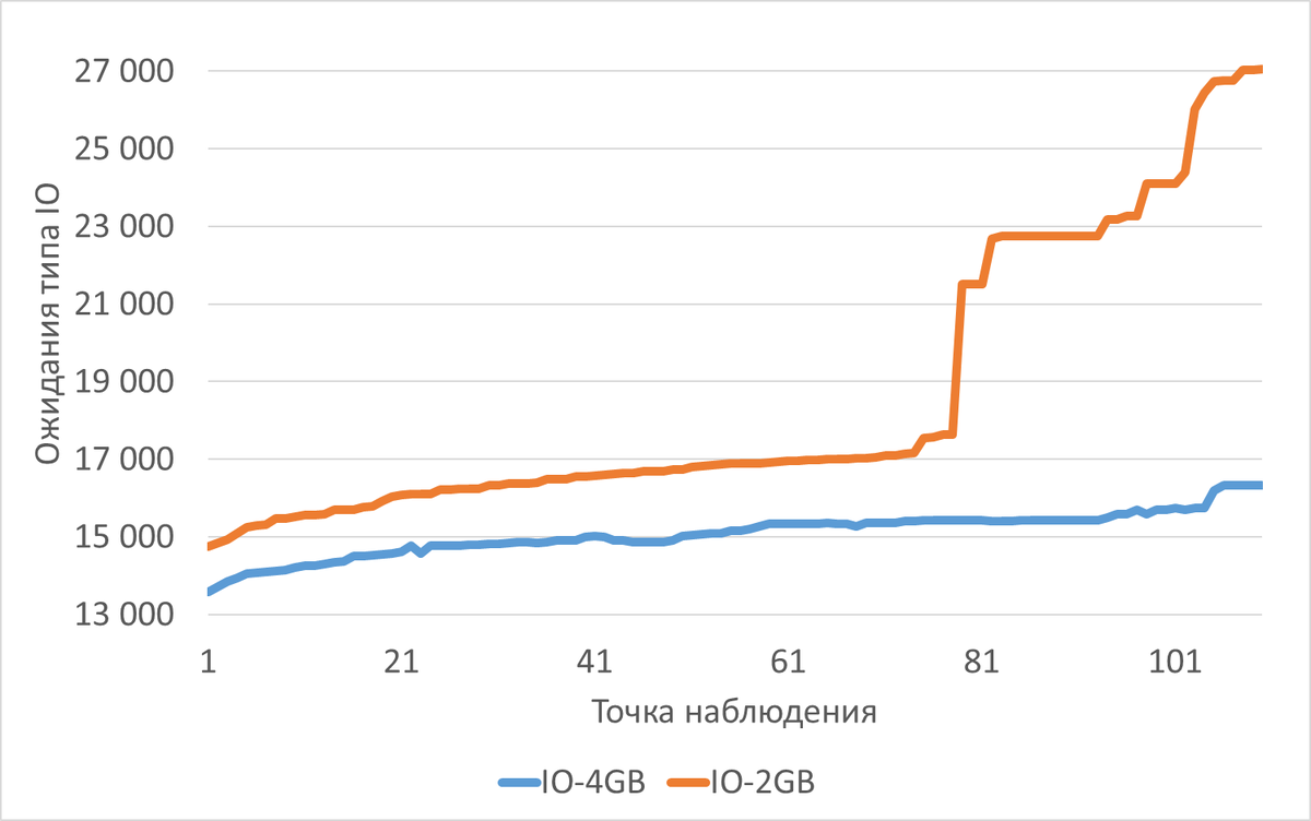 Среднее увеличение ожиданий типа IO при shared_buffers=2GB(work_mem=256MB) составило 22.70%.