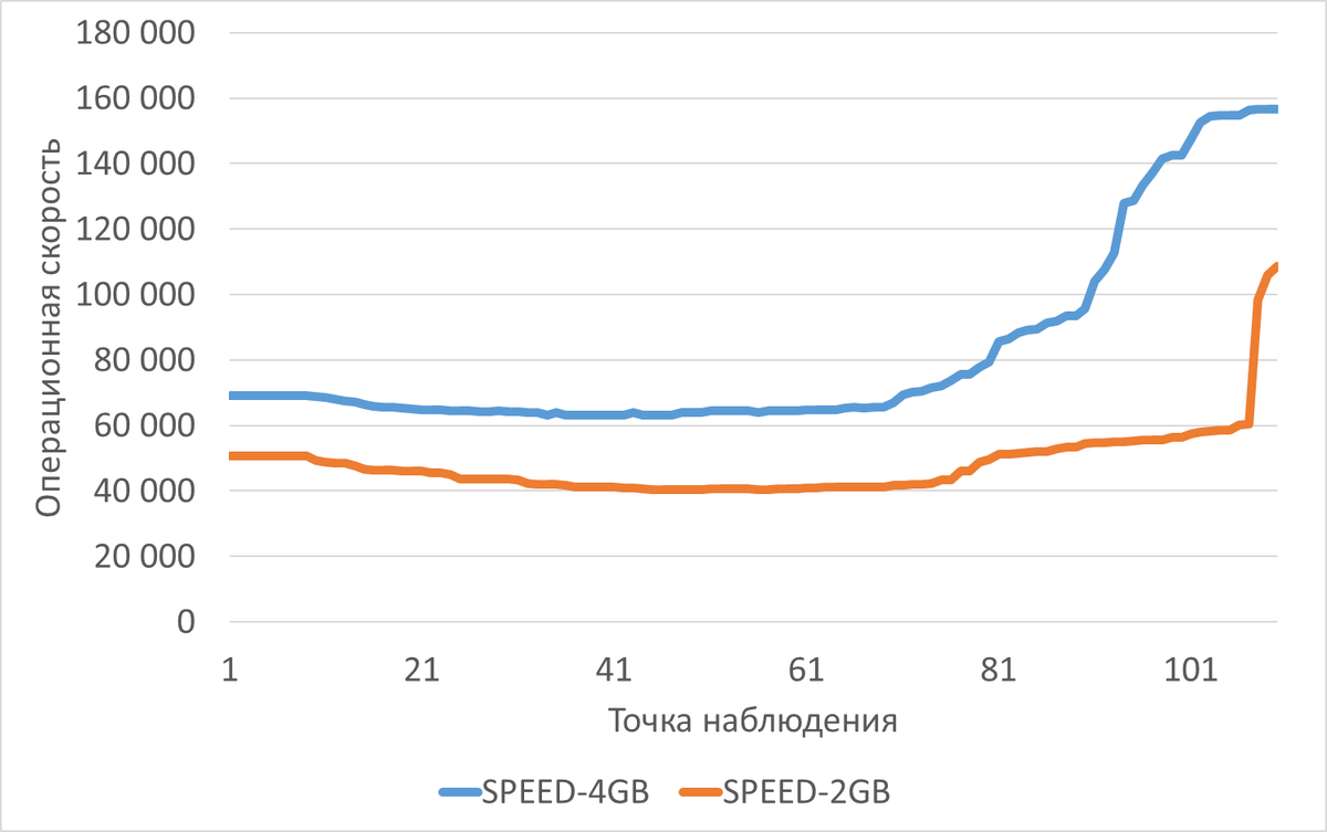 Среднее снижение операционной скорости при shared_buffers=2GB(work_mem=256MB) составило 38.38%.