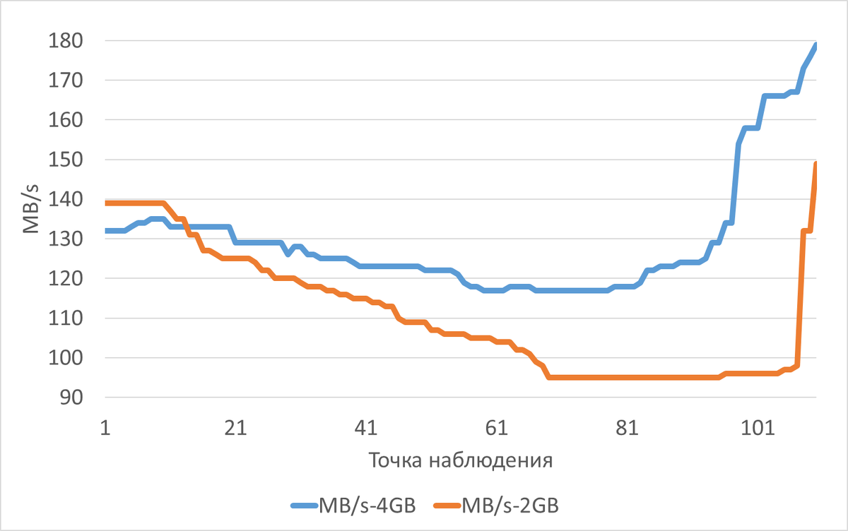 Средняя пропускная способность: ≈130 МБ/с → 180 МБ/с (рост к концу)