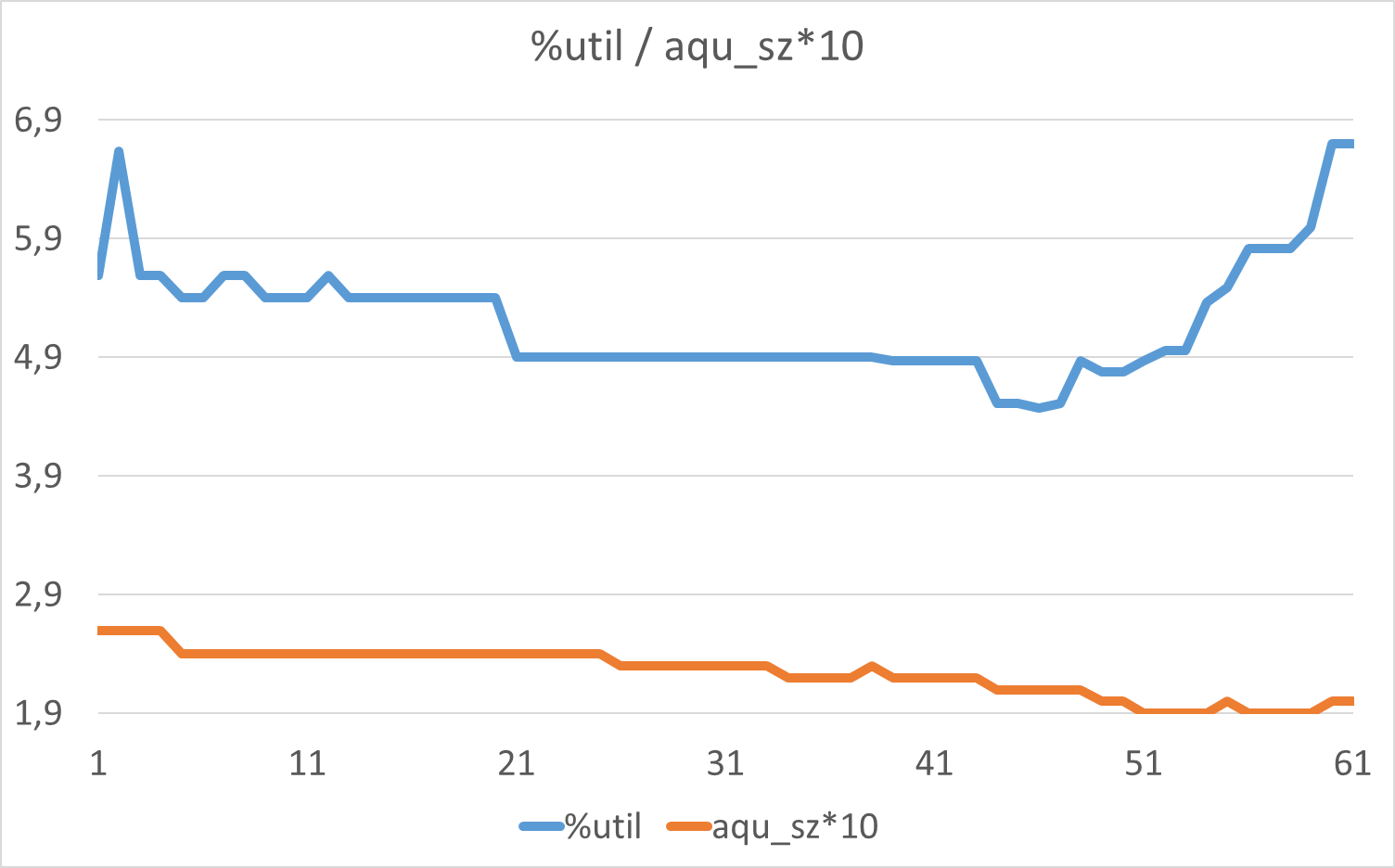 · aqu_sz (средняя длина очереди) незначительно снизилась с 0.26 до 0.20 — очереди практически нет.