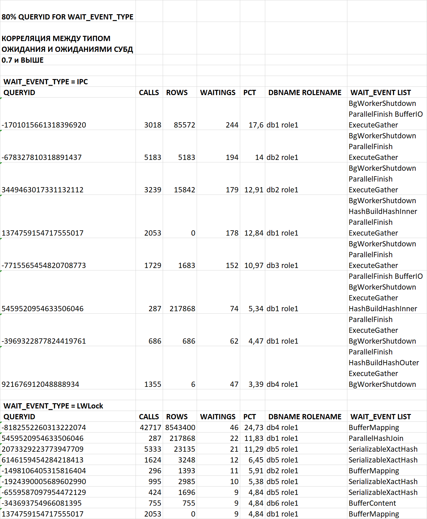 Проанализируй данные по событиям ожидания для SQL запросов по queryid в ходе инцидента производительности СУБД PostgreSQL