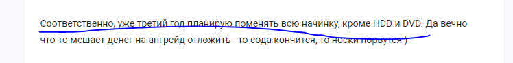 Соответственно, уже третий год планирую поменять всю начинку, кроме HDD и DVD. Да вечно что-то мешает денег на апгрейд отложить - то сода кончится, то носки порвутся )