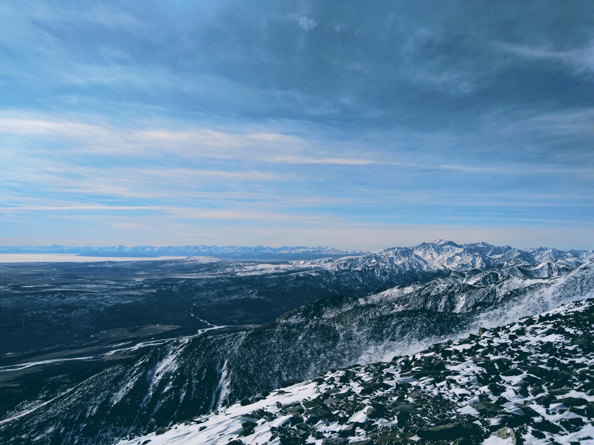 С пика нам открылся ошеломляющий сознание вид на Тункинскую долину, вершину Мунку-Сардык и скованные льдом Иркут и озеро Хуб-Сугул.