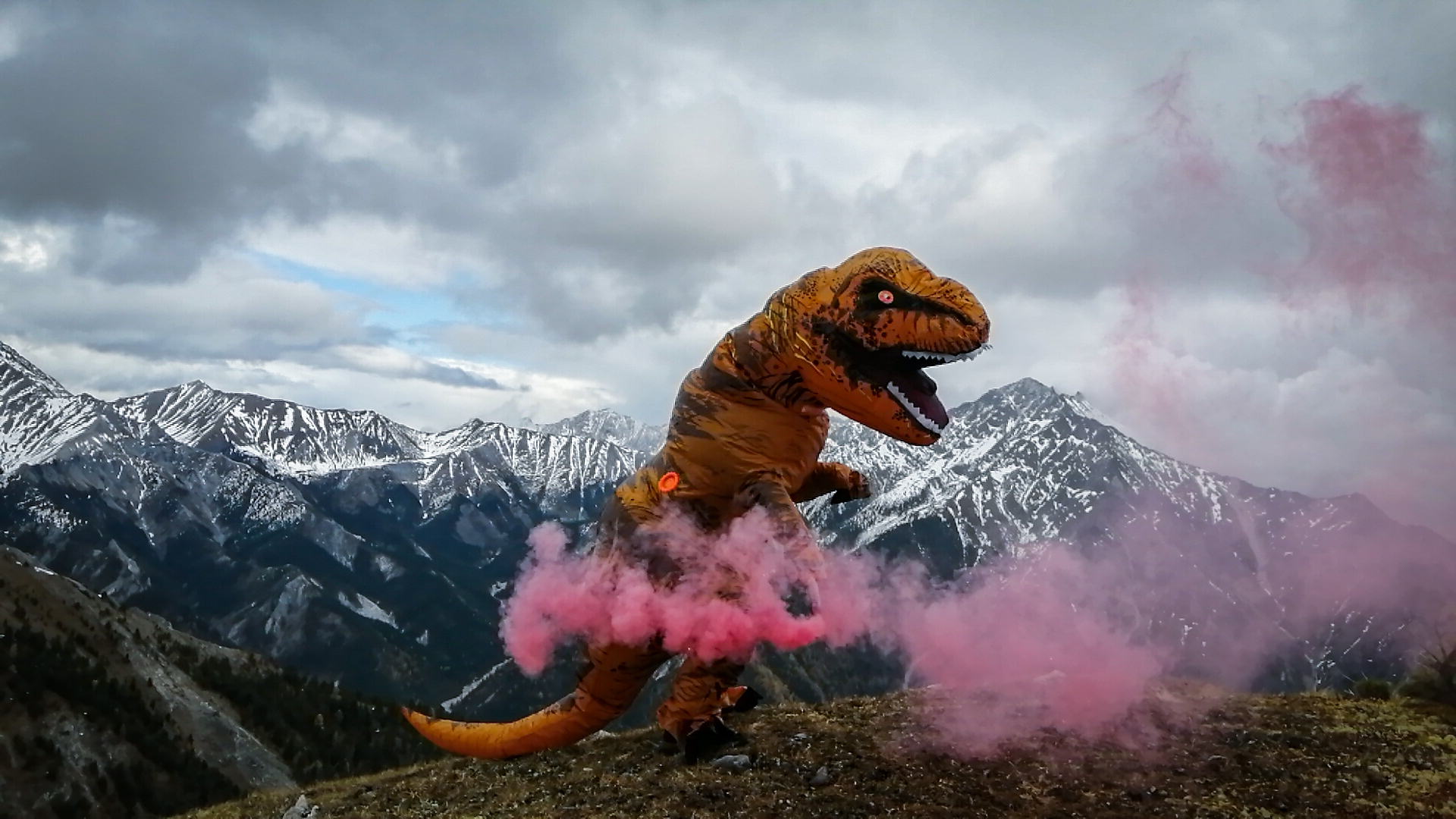После завтрака начали готовиться к выходу на гору. Тут Сергей неожиданно извлек из своего рюкзака новенький костюм тираннозавра с али, о нем он говорил, но я лично его еще не видал. Решили тут же его испытать. Влезть в него вызвался я. К моменту как я облачился в костюм, из ущелья на нас вышла еще одна группа туристов, которых я встретил радостным животным рёвом. Они были в восторге, пришлось остаться в костюме на гораздо большее время чем планировалось, так как от небольшой фотосессии уже было не отделаться. Наконец меня отпустили. Тирекс перекочевал в рюкзак, чтобы потом снова вырваться на свободу на хребте под Трехглавой.