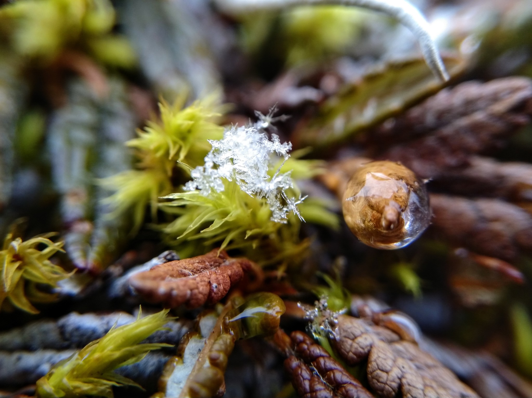 Поднимались траверсом по хребту. Шли очень неспешно, хотелось ухватить и прочувствовать сердцем каждый миг, каждое дуновение ветра и каждую снежинку упавшую на щеку. Так перешагивая с валуна на валун мы взобрались на острие хребта и пошли по верху, постоянно бросая взгляд на нашу цель, как будто боясь потерять ее. Вершину постепенно укутали облака. За 500 метров до вершины мы остановились и решили дальше не идти, поскольку личное достижение уже было у нас с прошлого года, а сидеть наверху в облаке с нулевой видимостью не было резона. Потому мы сбросили с себя рюкзаки, перекусили и занялись созерцанием и фотосъемкой. Пока Сергей и Алена фотографировали друг друга, я опустился на колени и начал изучать мхи и лишайники растущие под нашими ногами, где обнаружил целую оранжерею.