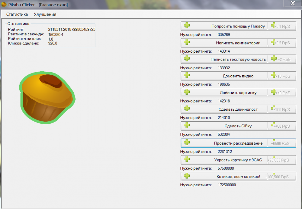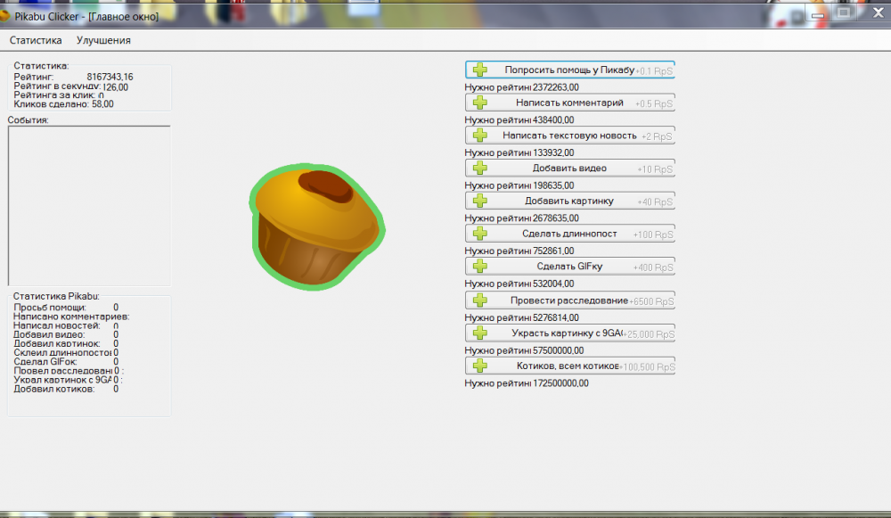 Также было бы неплохо чтобы улучшение как то отображались, например как в печеньках когда покупаешь бабку то эта бабка появляется на экране. Думаю это можно реализовать в духе профиля на пикабу, где отображаются все твои посты. Например купил "сделать гифку" и появляется твой пост со случайной гифкой. Было бы прикольно если бы программа синхронизировалась с сайтом пикабу и брала оттуда эти случайные посты. В этом был бы свой отдельный интерес покупать улучшения чтобы посмотреть что же за пост создастся на этот раз)