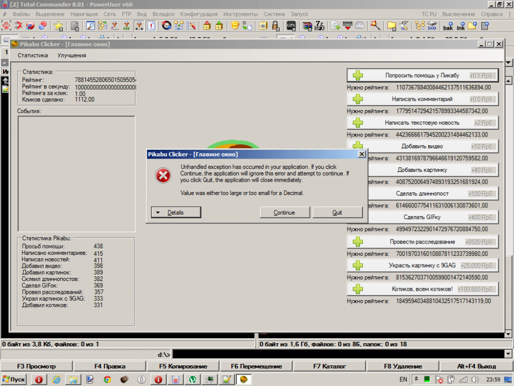 ************** Exception Text ************** System.OverflowException: Value was either too large or too small for a Decimal. at System.Decimal.FCallAddSub(Decimal& d1, Decimal& d2, Byte bSign) at Pikabu.clicker.RpS_Tick(Object sender, EventArgs e) at System.Windows.Forms.Timer.OnTick(EventArgs e) at System.Windows.Forms.Timer.TimerNativeWindow.WndProc(Message& m) at System.Windows.Forms.NativeWindow.Callback(IntPtr hWnd, Int32 msg, IntPtr wparam, IntPtr lparam)