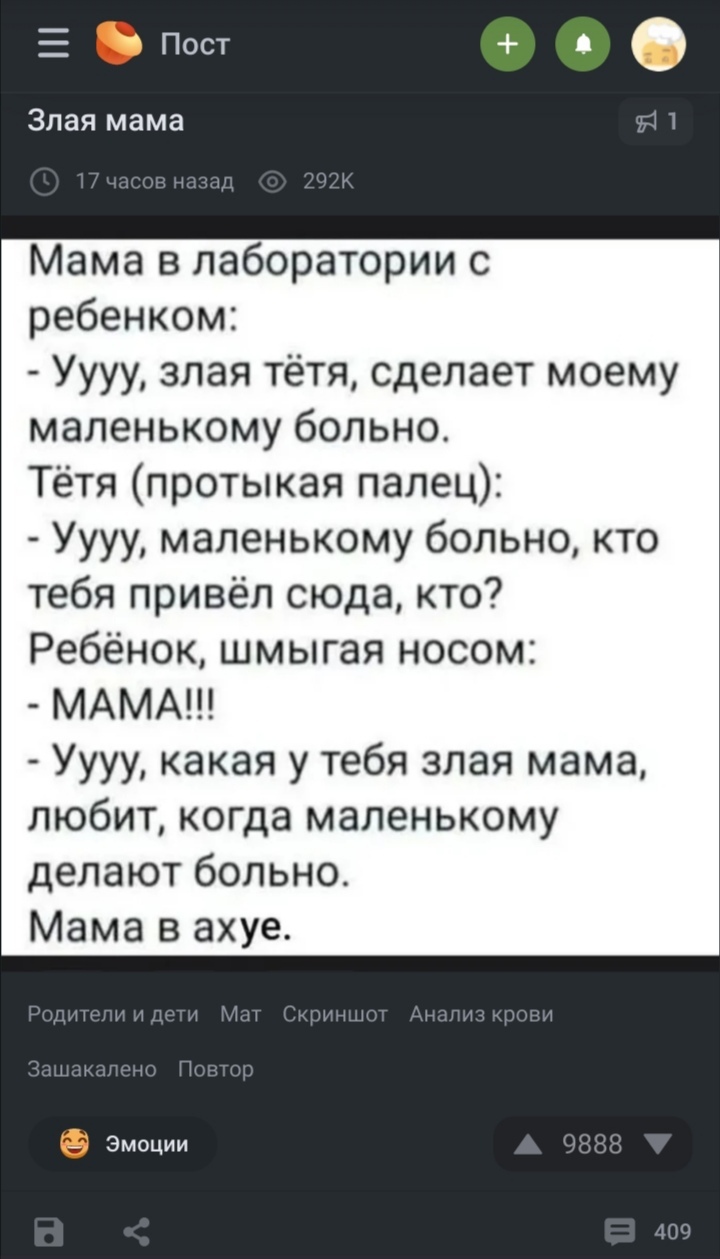 Уже 10 000 рейтинга в убогом бояне взятого из колонки "Полный хохотач" в рекламном проспекте с вонючей барахлоки. Наложены полные комментарии восторженных визгов, и хвастовства своими детками. Всё забито похожими историями от которых рыдал уже целый автопарк маршруток. И при этом, тут же не отходя от кассы, эти массы истерят от последних правок в правилах Пикабу, которые по их словам превратят прекрасный сайт в противные "Одноклассники". Эти аристократы конечно, не такие, они элитарные искусствоведы, ценители изысканного юмора, а не лохматые старики с Одноклассников. А я, обращаю внимание, что оригинал текста, скопированный без изменения, уже имеет возраст больше чем ребёнок из истории. https://russiaru.net/Sashavolf58/status/41df10000ff78 и ещё было в твиттере https://x.com/drunktwi/status/1398646321104527362